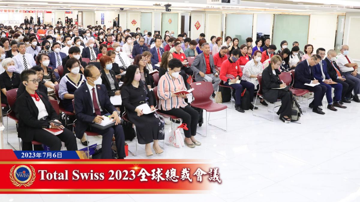2023年7月6日下午14:00,Total Swiss 2023年全球總裁會議在Total Swiss台北公司七樓大會議室舉行,來自16個國家的全球一星總裁、二星總裁以及皇冠總裁齊聚一堂,現場的每一個總裁,都是Total Swiss一份寶貴的戰力,而所有總裁聚在一起的場面,更是一個Total Swiss開創新局的壯盛軍容。經過王博士的勉勵與引領之後,總裁們也將會在未來的道路上全力以赴、更上層樓。