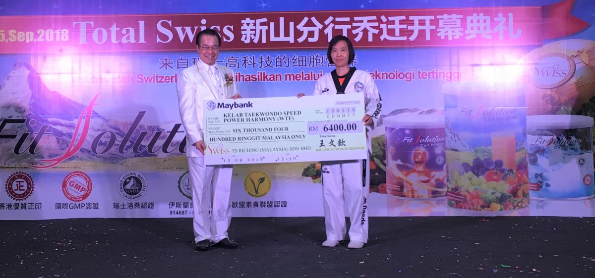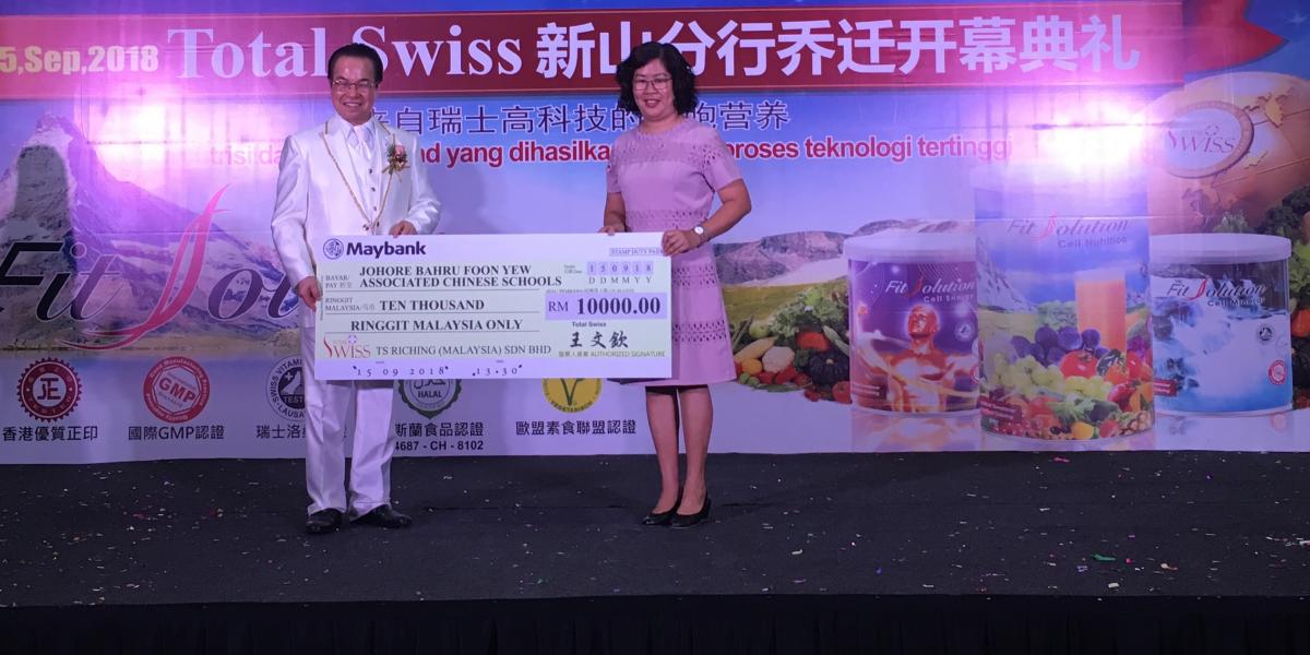 本於「取之社會與用之社會」的經營理念,本次新山分行喬遷典禮,王博士也同時捐贈柔佛州寬柔中學、跆拳道社以及育幼院各一萬元、六千四百元及五千元馬幣。受捐單位也同時回贈感謝狀以感謝Total Swiss「取之馬來西亞用之馬來西亞」的社會企業行動。