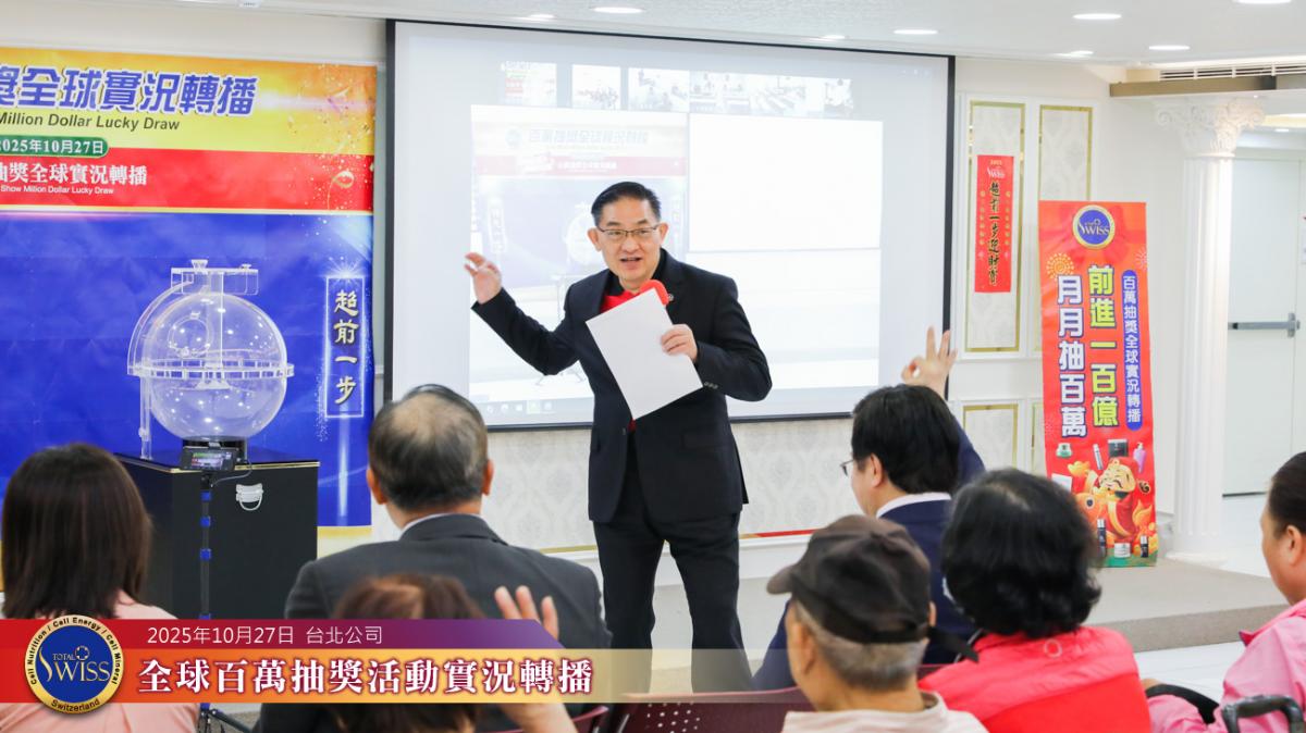 2025年10月27日下午1點30分,Total Swiss第46回全球百萬抽獎在台北總公司七樓舉行。