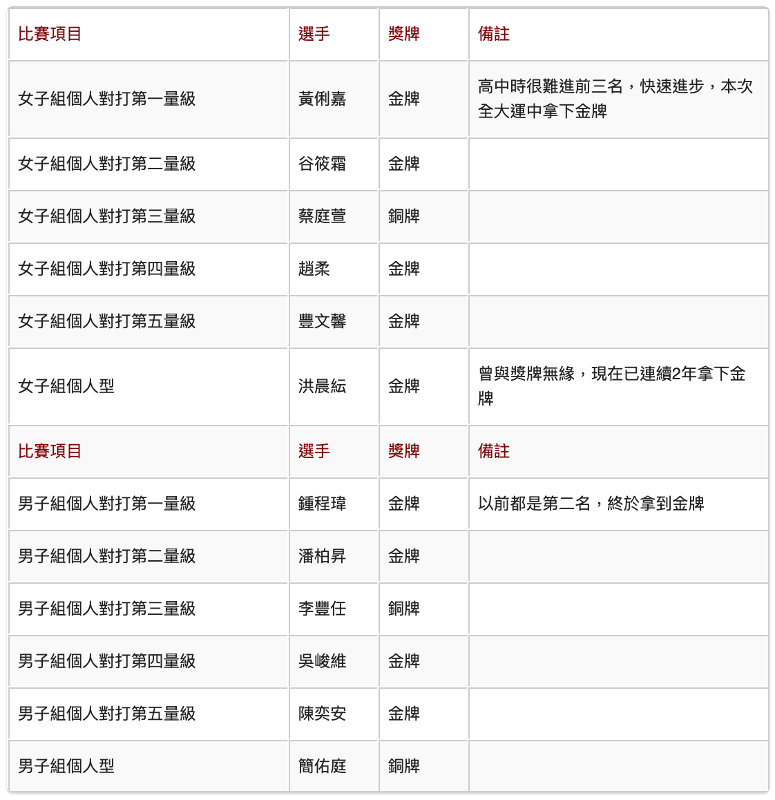 108年全國大專運動會 北市大空手道隊選手得牌一覽表