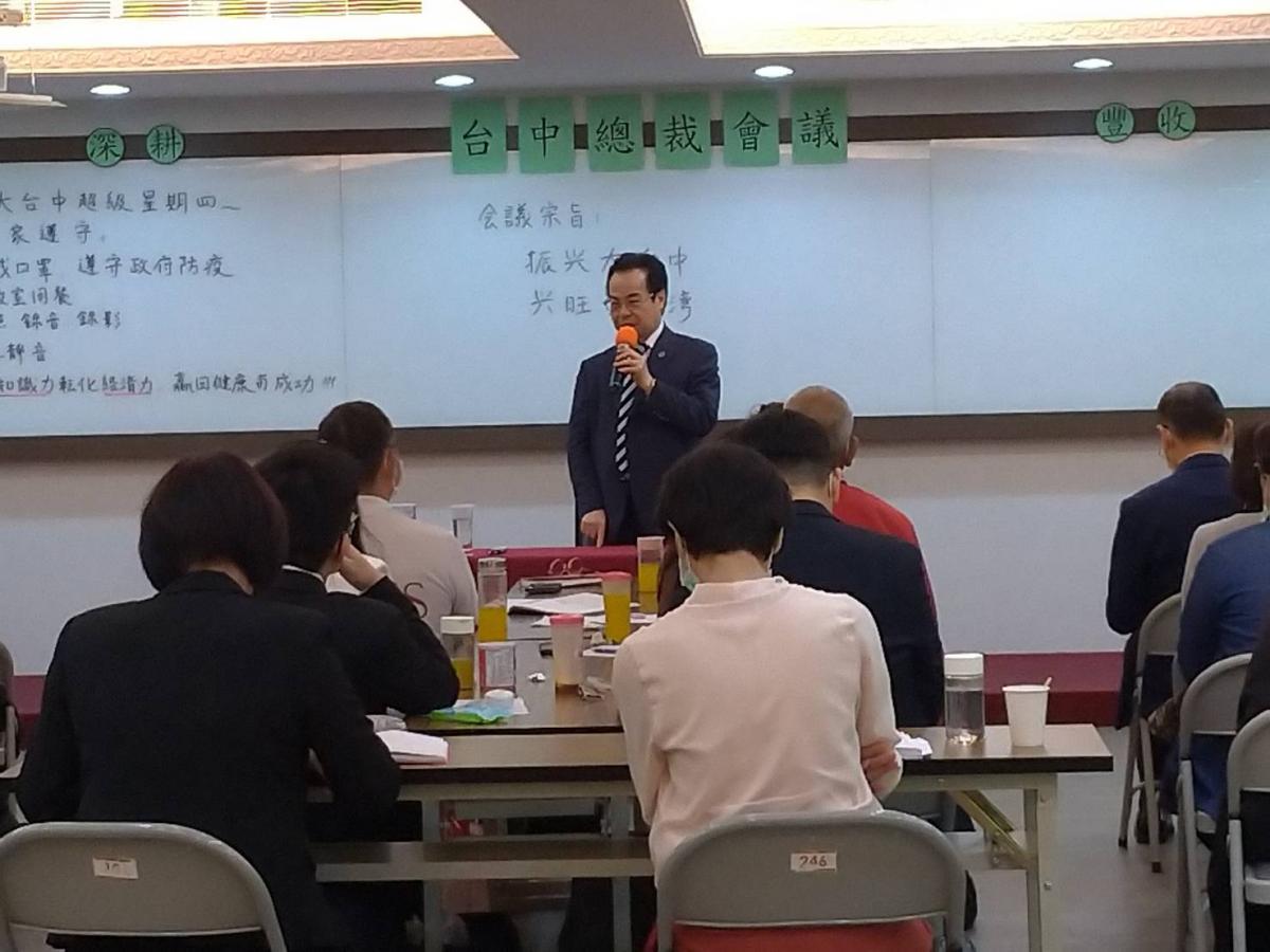 創辦人王博士在5月的第一個開工日抵達台中公司,並與全體中區總裁們會議。