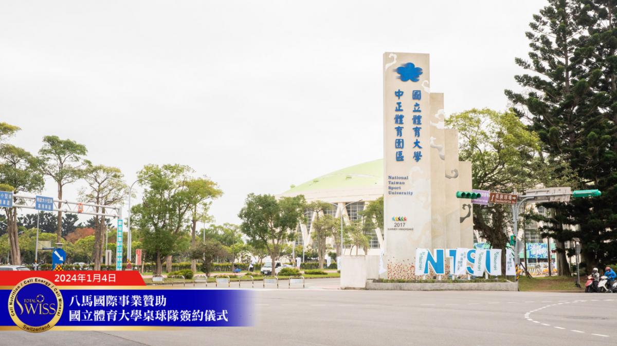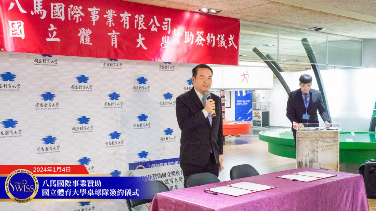 2024年1月4日上午10點,Total Swiss八馬國際事業贊助國立體育大學簽約儀式於國立體育大學體育與圖書博物館成果展區舉行。