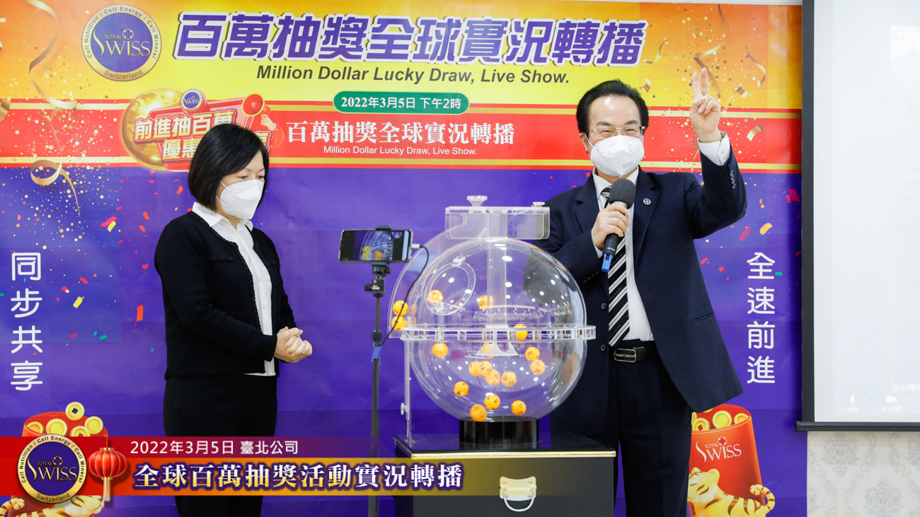 在抽獎前,王博士對現場及線上夥伴表示,有些人看到樂透抽獎機,一開始會以為這是一種賭博行為,但事實上,Total Swiss的百萬抽獎跟傳統的抽獎其實是一樣的,只是,做法上有所不同。