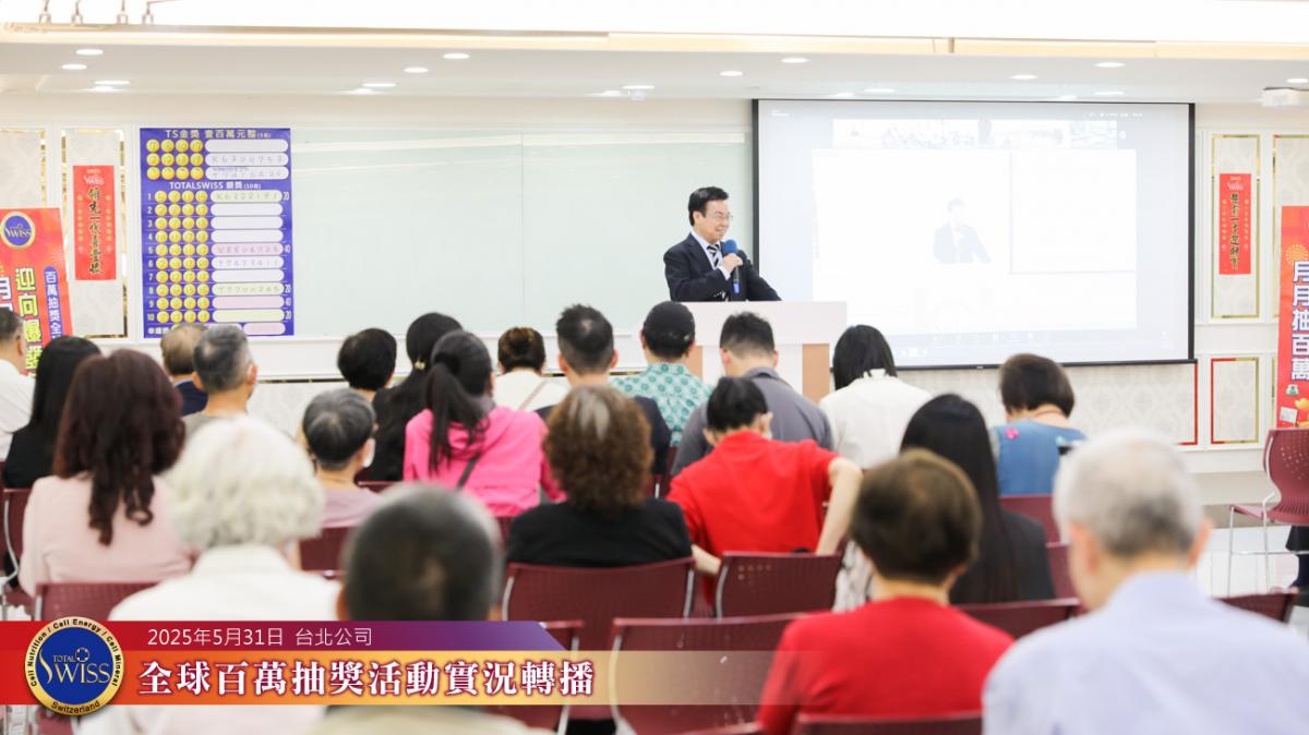 在第41回Total Swiss 全球百萬抽獎結果出爐,由台灣與韓國夥伴各得一個一百萬大獎,而另外一個百萬大獎留待第42回抽獎之後,王博士為台北現場的夥伴與貴賓丹斯里翁伉儷以及透過視訊一起參與的Total Swiss全球夥伴進行了一場講座。在講座中,王博士詳細解析「不生病的智慧」,智慧兩個字,一共包含了看全局、切重點、能溯源、有方案四個要素。