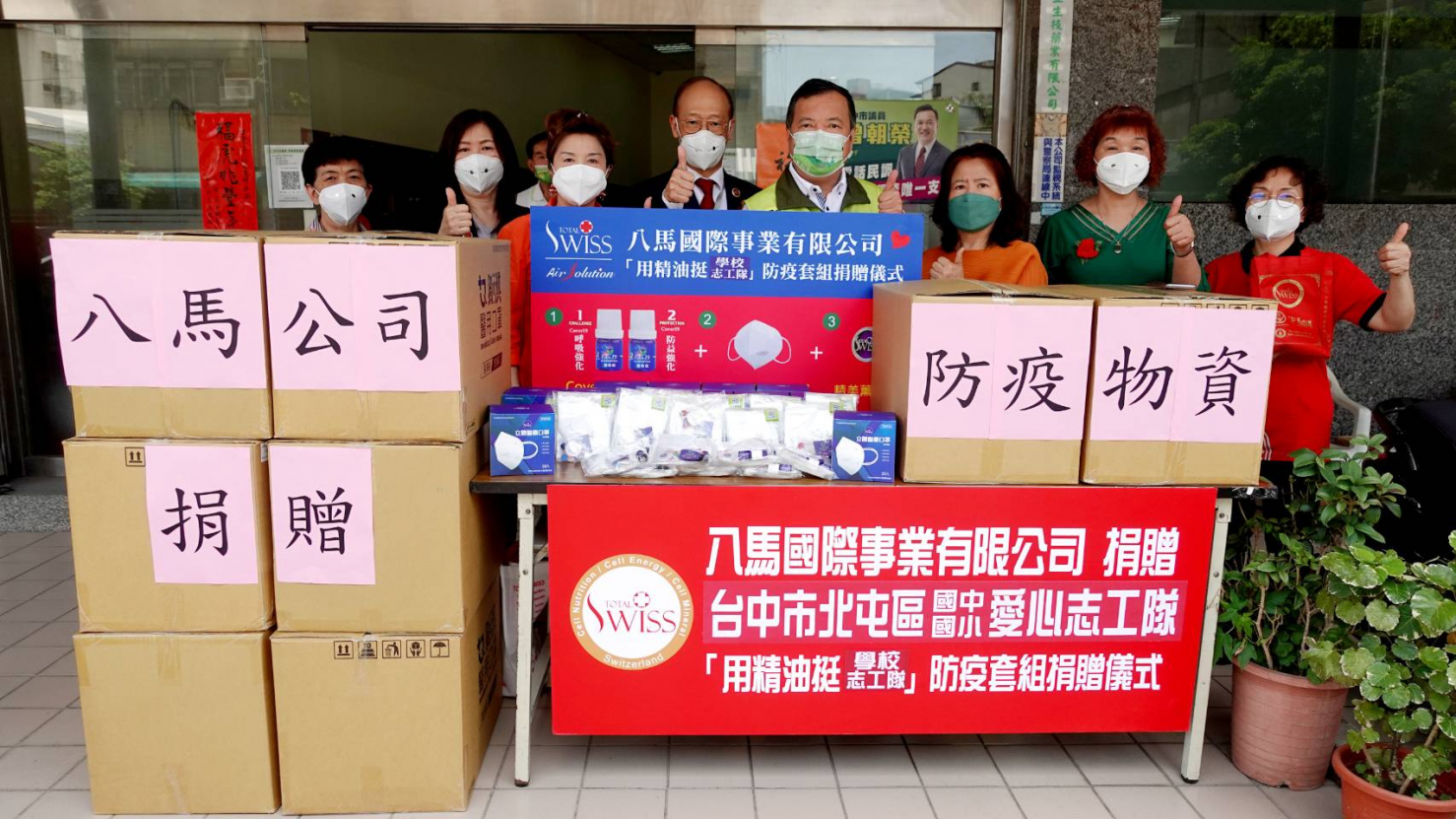現在,Omicron防疫危機再起,為了幫助每日在學校幫忙的國中、小學志工媽媽進行防疫,保護志工媽媽也保護他們服務學校的孩子,曾經在去年間參與Total Swiss力挺前線捐贈活動的台中市議員曾朝榮,乃向王博士出第49場防疫精油捐贈計畫,而王博士也一口允諾這一次總金額高達144萬元的捐贈活動,包括防疫精油1800瓶90萬元,N95口罩9000片36萬元,香氛扣1800個18萬元。