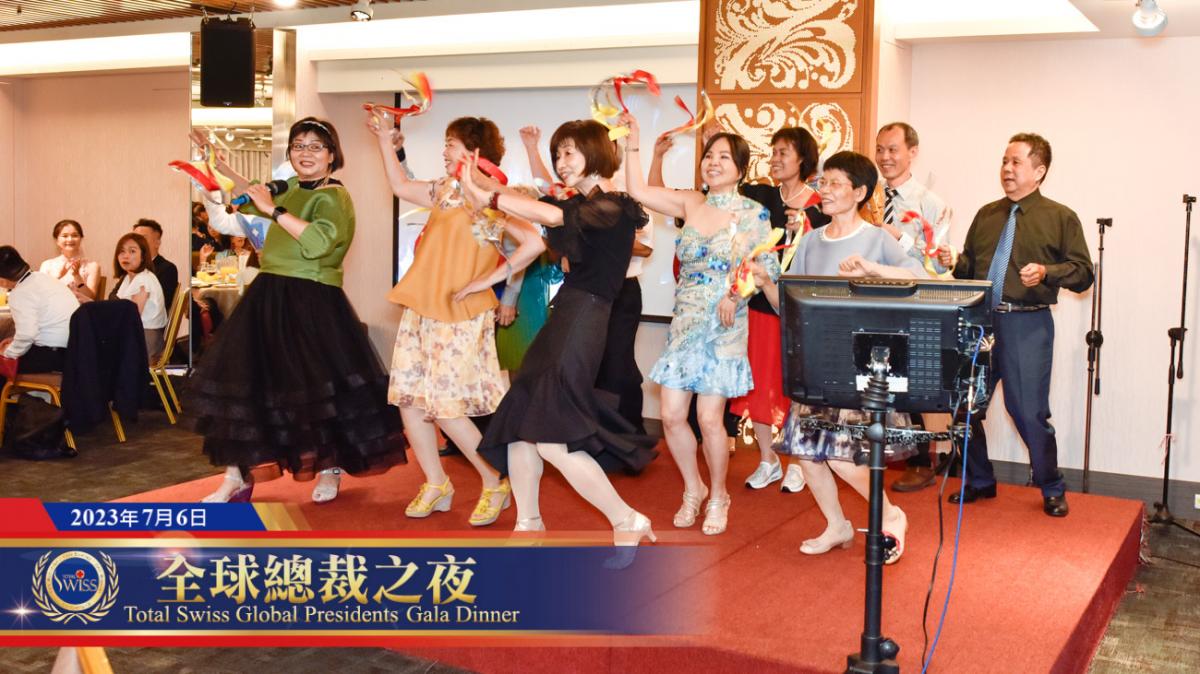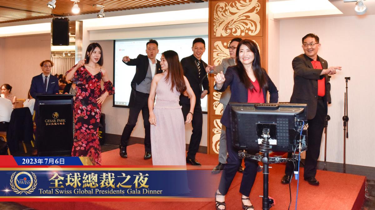 不過,Total Swiss從來就是一個充滿奇蹟的公司。在吃完第一道菜,由鄧秀華總裁團隊曾煥標總裁率先開唱「成功的條件」暖身,然後由高雄總裁團隊接棒勁歌熱舞張惠妹的「跳進來」;跳進來熱力未散之際,緊接著就是本次頒聘大會主持群邱瑞靜皇冠、林弘諭皇冠、阮氏錦威總裁、余泓毅總裁、凌偉峻總裁、柳佳賢、山下敏維、阮玄等人用很短時間演練出來的「魔性搖擺」舞蹈表演,這幾位來自台灣、韓國、日本、新加坡、越南的主持人,在搖擺之間,充分展現出了彼此無間的默契,而這份默契,也是王博士找他們一起來主持頒聘大會的原因。