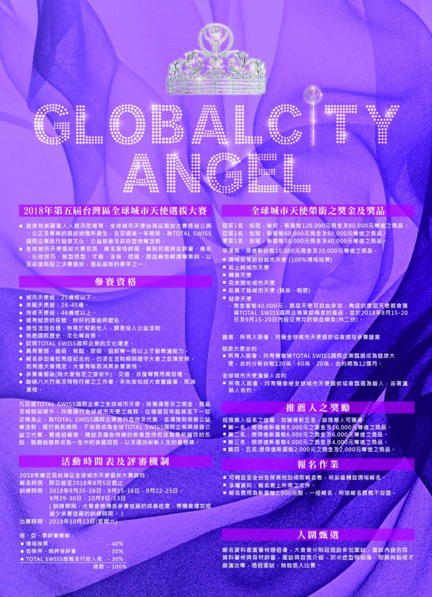 第五屆全球城市天使選拔大賽的主題為「孔雀開屏」,寓意在任何在城市中的灰姑娘,都可透過由Total Swiss的選拔舞台,綻放像孔雀般美麗。報名期間:2018年7月25日至8月5日決賽日期:2018年10月13日(週六)報...
