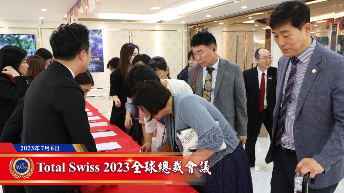 2023年7月6日下午14:00,Total Swiss 2023年全球總裁會議在Total Swiss台北公司七樓大會議室舉行,來自16個國家的全球一星總裁、二星總裁以及皇冠總裁齊聚一堂,現場的每一個總裁,都是Total Swiss一份寶貴的戰力,而所有總裁聚在一起的場面,更是一個Total Swiss開創新局的壯盛軍容。經過王博士的勉勵與引領之後,總裁們也將會在未來的道路上全力以赴、更上層樓。