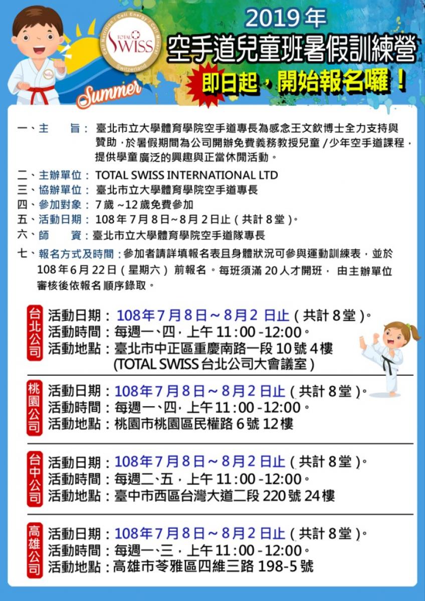 2016年初,Total Swiss開始贊助台北市立大學空手道隊。年中,Total Swiss在16年暑假開始舉辦空手道兒童暑期訓練營,免費教授兒童及少年空手道課程,提供12歲以下的孩子在暑假期間參加正當休閒活動。前三期...