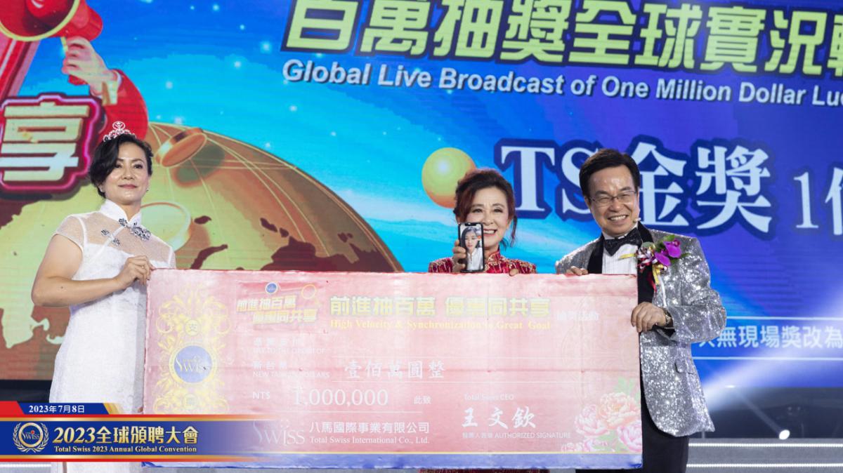 最後,財神爺阮錦威總裁又一次接棒主持抽獎活動,在律師的見證下,王博士抽出了本次大會的現場最大獎100萬元以及四十幾位一萬元的幸運獎。100萬元現場獎得主是本次受聘的王述和皇冠總裁的下線。顯然的,心念一動、採取行動,還能夠為組織成員招來好運。