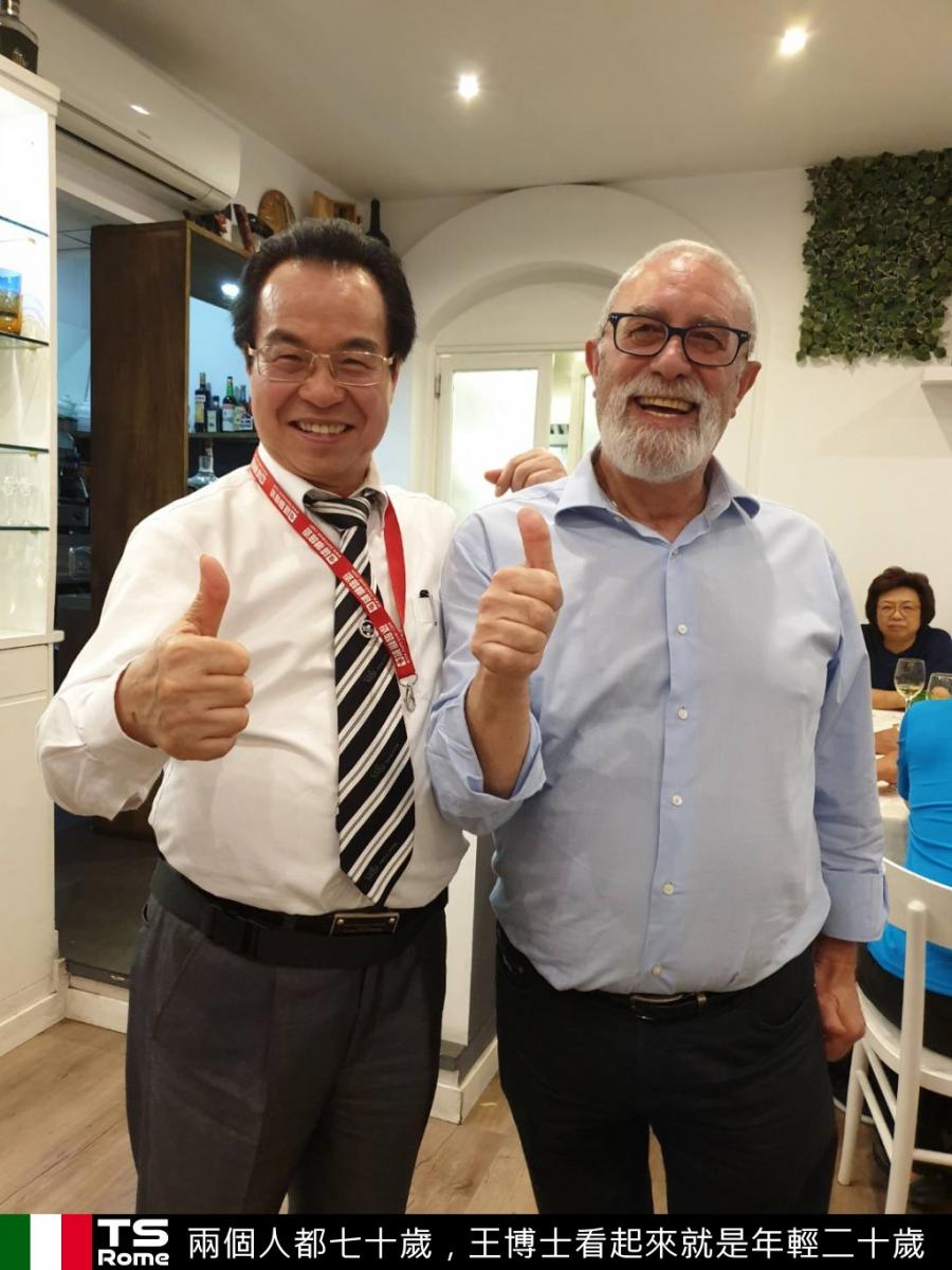 由於王博士已經是第二次帶領Total Swiss羅馬團上門,餐廳白鬍子老闆對六月團別有一種獨特的親切感。 寒暄中,大家才知道,原來白鬍子老闆跟王博士一樣都是七十歲。賓主間多了一份同庚之誼,兩人於是忍不住拍了一張合照。