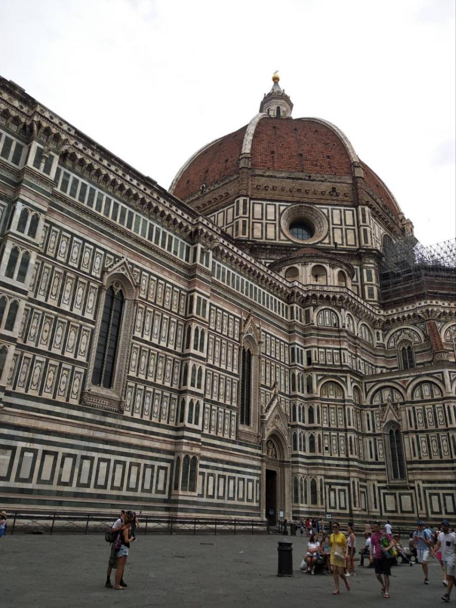 然後,走幾步路,就是聖母百花大教堂與聖約翰洗禮堂。 由於百花大教堂實在太過精緻,以致於人們常常因為它的繁複美麗而忘記了它的巨大宏偉,直到抬頭遠望圓頂觀景台那些近似螻蟻的遊客,這才令人驚嘆尋思,數百年前的人們,究竟是使用了什麼樣的黑科技?能夠用磚塊和大理石,把一座建築物建到八十五公尺那樣的高度,維持了七百多年那樣久。