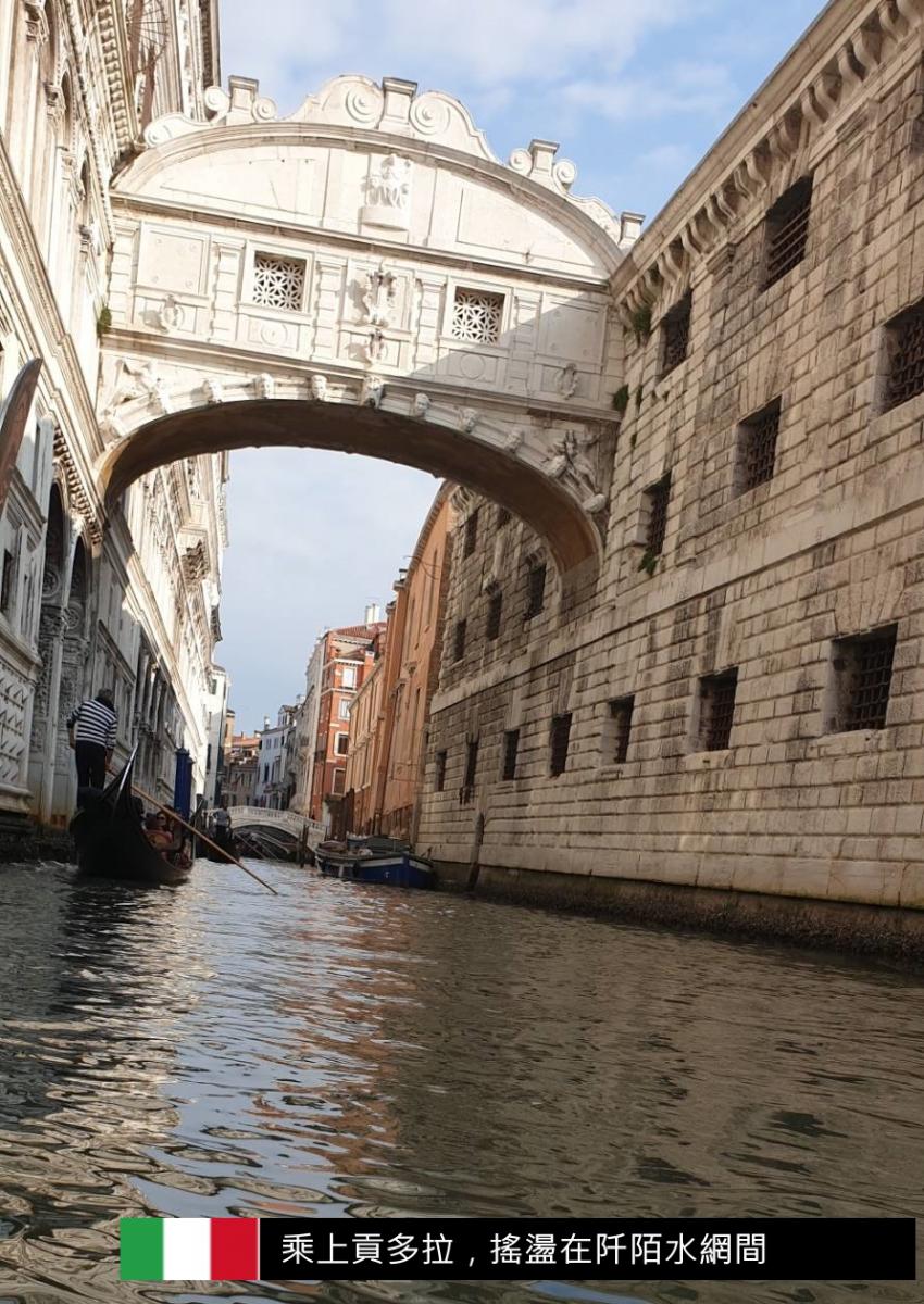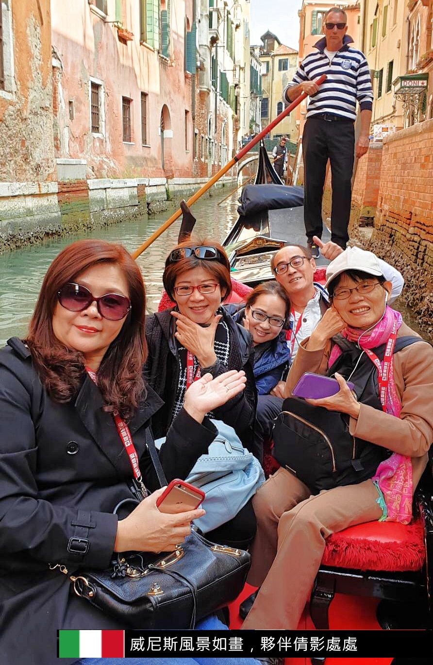 4月10日早上,我們來到威尼斯城區,過去遙遠的想像與憧憬,此刻就在我們的眼前。 我們迫不及待的,六人一組登上電影中那搖擺生姿的貢多拉,穿梭在留有歲月斑駁痕跡的磚紅水巷之間與古老石橋之下。 正在隨著水波蕩漾陶然自得之際,貢多拉到達了終點,我們只好抱著不捨的心情踏上岸邊。