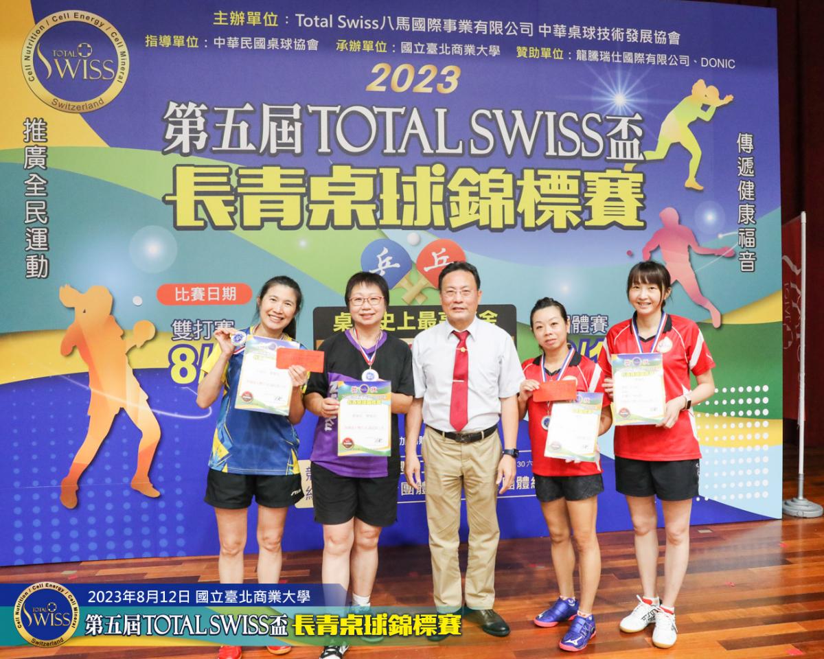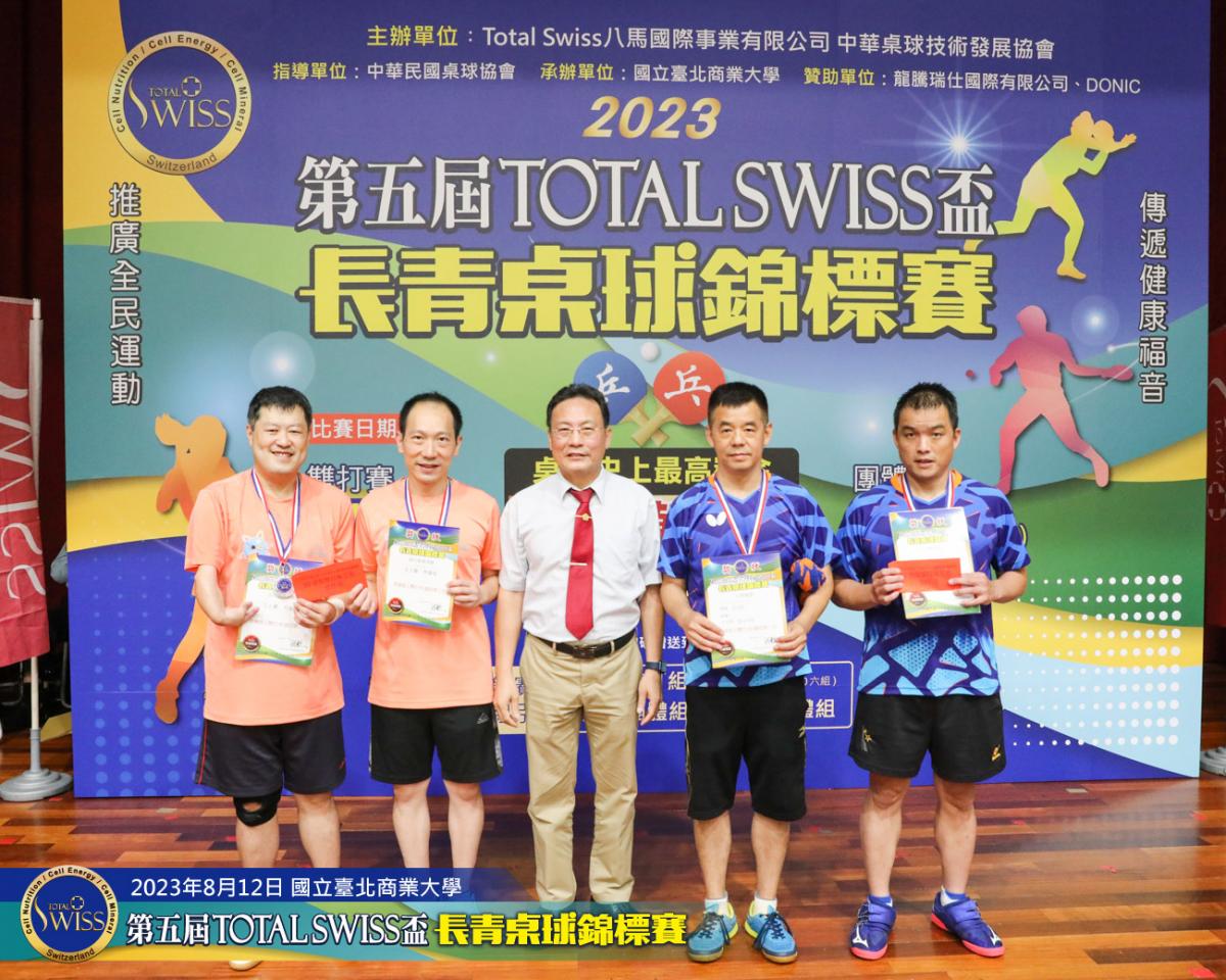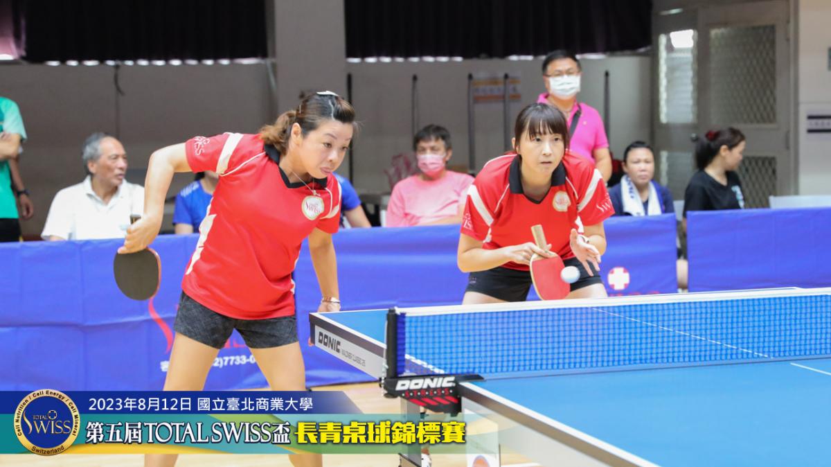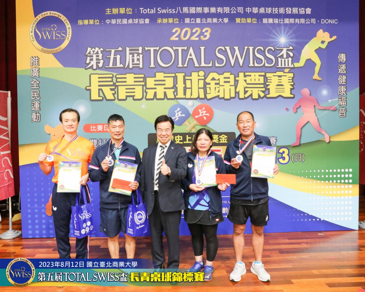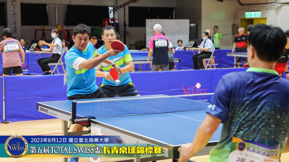 2023年8月12日上午9點鐘,第五屆Total Swiss盃長青桌球錦標賽在台北商業大學活動中心正式開打,比賽共分兩天進行,第一天登場的是80歲至130歲6個歲組的雙打比賽,一共吸引三百多位年齡40歲至82歲之間的桌球猛將報名參加。