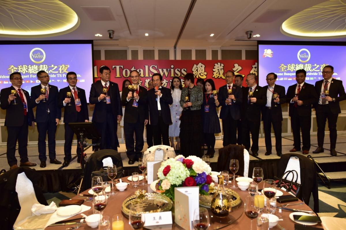 在晚宴上,王博士特別帶領台灣、香港、新加坡、馬來西亞、日本、韓國、印尼、泰國、菲律賓、澳洲等全球總經理,使用從威尼斯水晶島帶回來的鍍金水晶杯向大家舉杯,祝願Total Swiss全球市場,在登上第一個十年的小小的高峰之後,還要向著更高的目標邁進。