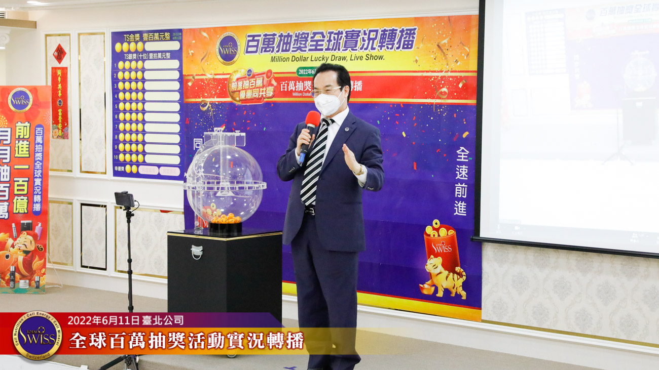 第六次百萬抽獎全球實況之後,王博士接著進行一場全球健康講座。講座中,王博士向現場及線上全球夥伴公開了一個Total Swiss邁向嶄新紀元的大消息,並預示,下個月還會有另外一個石破驚天的好消息。王博士期勉全球夥伴,在飛躍再起的大好時機,大家要加快腳步,緊緊的跟隨豐收號角。