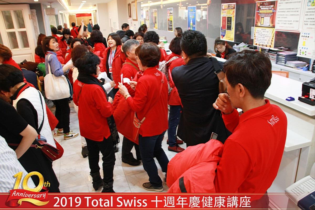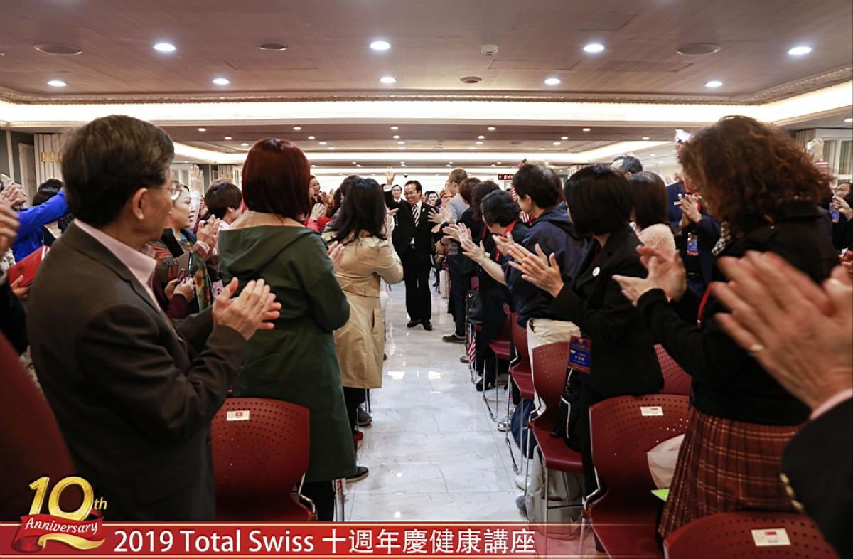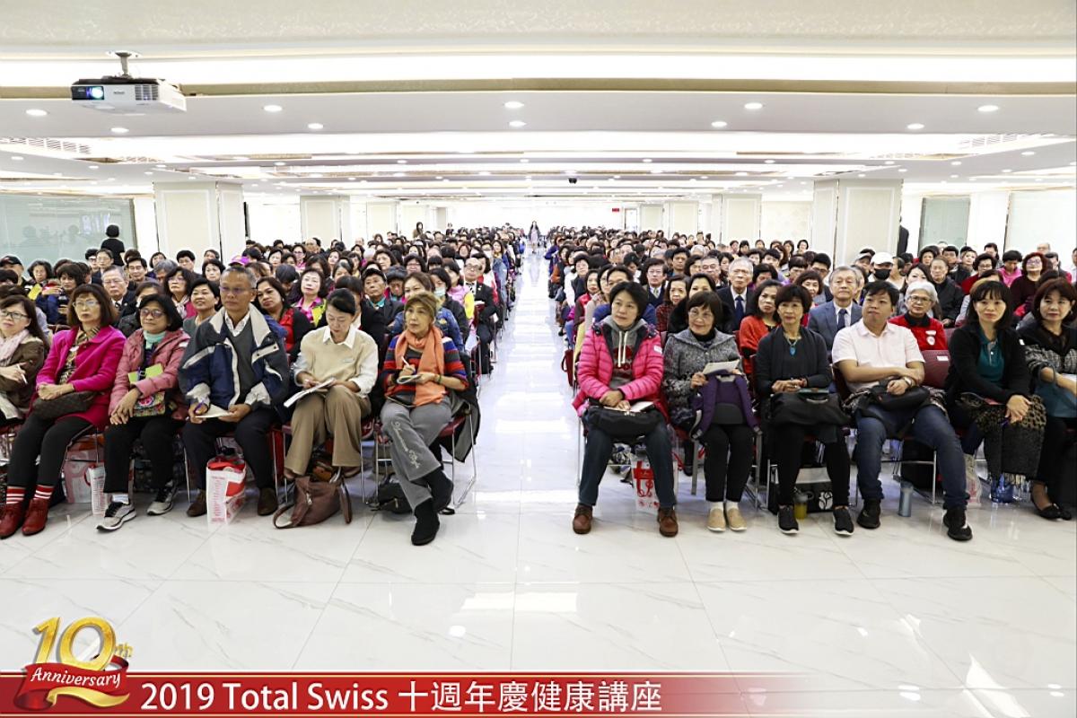 Total Swiss十周年年會暨2019頒聘大會第二天,2019年12月13日,王博士在Total Swiss台北辦公室二樓舉辦健康講座。由於人數眾多,二樓大辦公室席位保留給海外回來的夥伴,台灣本地夥伴則透過同步視訊,...
