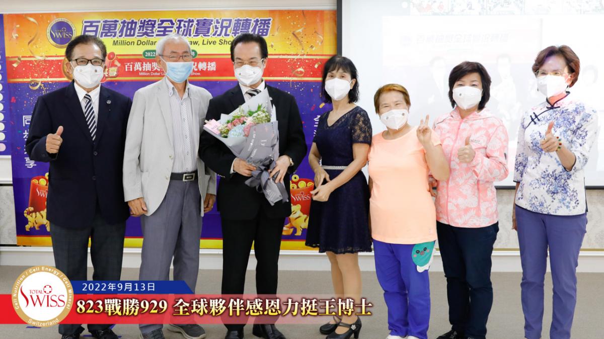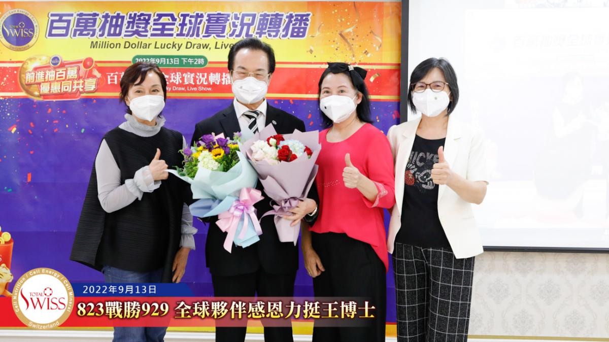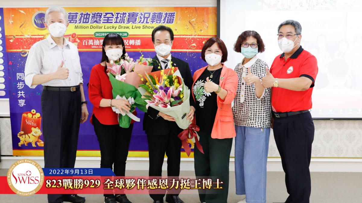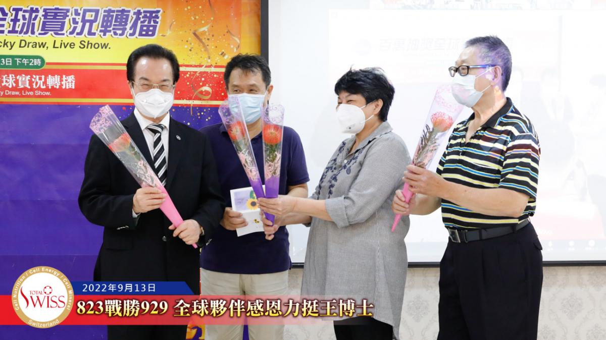 隨後,在台北現場的各事業團隊,包括星光團隊、冠軍團隊、領袖團隊等依序上台向王博士獻花致意,感謝他用無比的意志奮戰到底,為公司贏得勝訴的勝利。