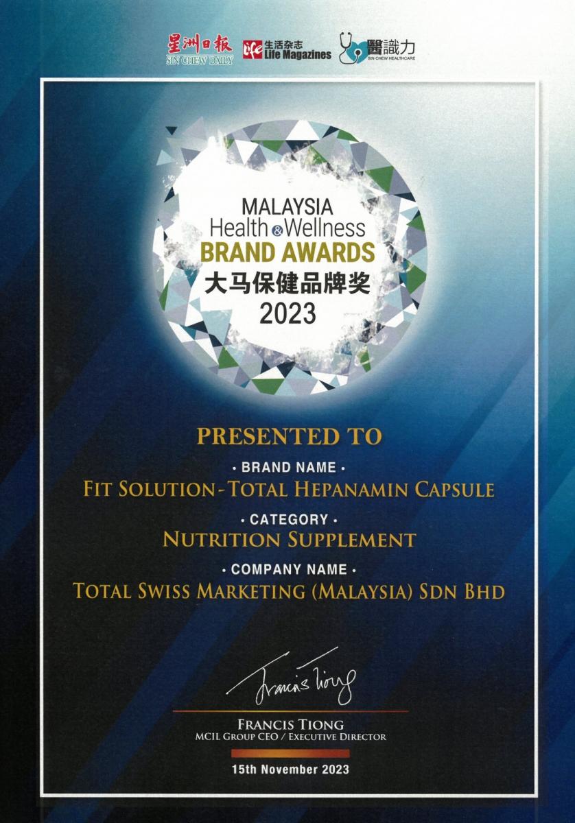 大馬保健品牌獎由《星洲日報》《生活雜誌》《醫識力》等媒體聯合舉辦,迄今已舉辦五屆,並且成為馬來西亞地區健康品牌的評鑑標竿,受到馬來西亞衛生部門的肯定,本次Total Swiss兩大產品獲獎,皆由衛生部長紮麗哈•慕斯達法醫生(Y.B Dr. Zaliha Mustafa)親自頒發給王博士,以象徵大馬政府對Total Swiss優良品牌與產品的肯定。