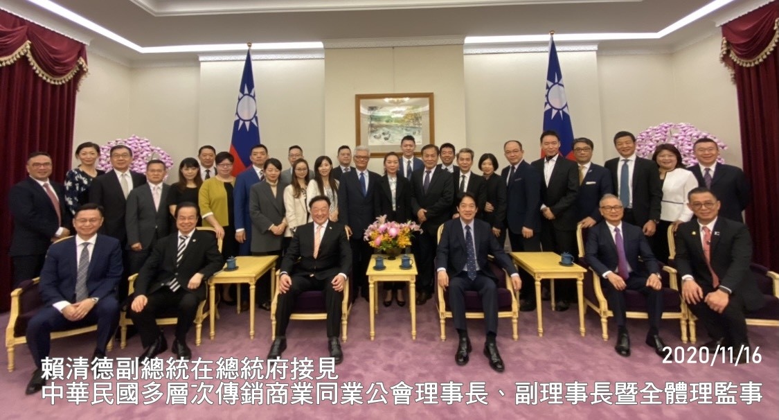11月16日,賴副總統繼續用行動表達他對傳直銷的肯定與力挺,在總統府接見傳銷公會理事長謝進興、副理事長王文欽、葉國淡及全體理監事。