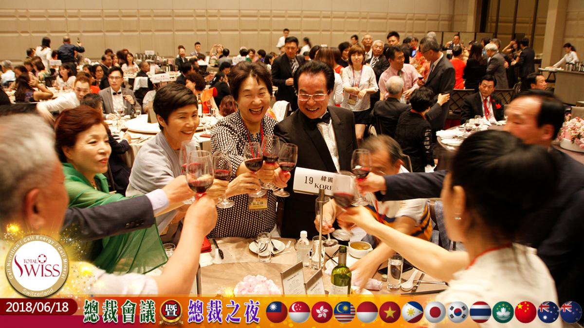 2018年6月18日全球總裁暨主管會議之後,稍作休息與換裝,傍晚隨即舉行Total Swiss全球總裁之夜,王文欽博士以萬豪酒店國宴等級的美食宴請全球總裁。