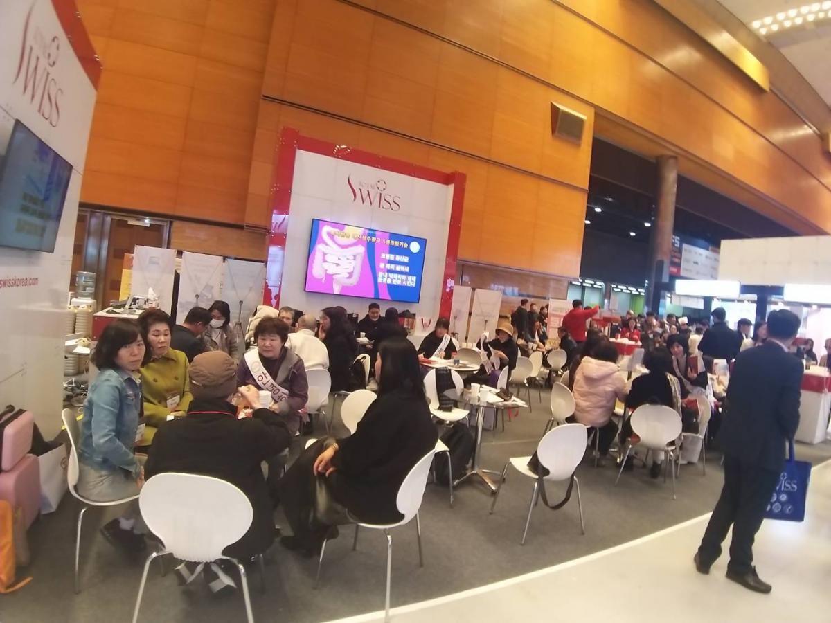王博士在21日一早就趕到展位坐鎮,一方面幫忙看驗血報告,一方面在現場扮演現場夥伴們的超級大A,超級忙碌。而金東原皇冠、文智慧皇冠、林仙玉皇冠等TSK高階領導人也是一大早就陸續帶著團隊夥伴抵達展場,熱情的向被Total Swiss展位獨特魅力吸引過來的人們,詳細分享Total Swiss第一名的產品與在韓國充滿無限潛力的事業前景。