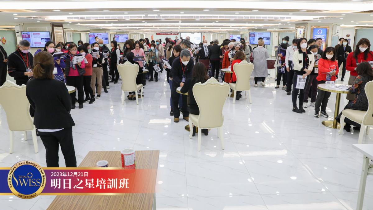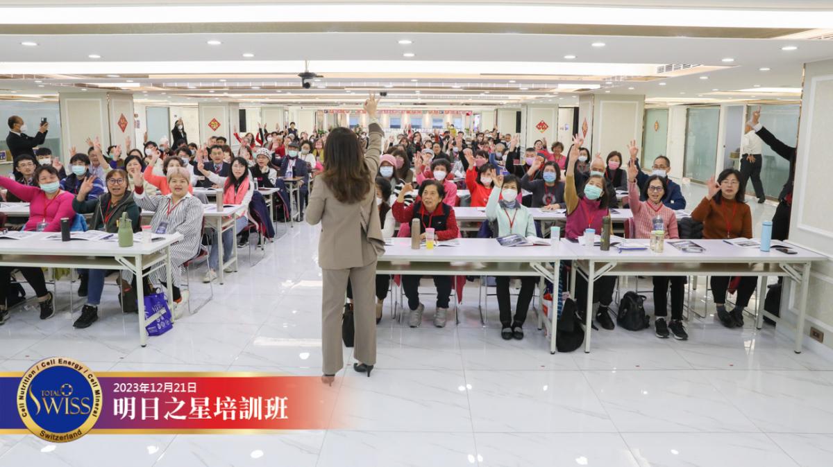 12月21日,在2023年度首波寒流的低溫中,Total Swiss在台北公司七樓舉辦「明日之星培訓班課程」,近百位學員有人來自台東、有人來自南投山上,甚至遠道從炎熱的馬來西亞專程飛來學習。同時,在課堂的後場,還有數十位皇冠總裁、總裁及上線推薦人陪同一起學習。