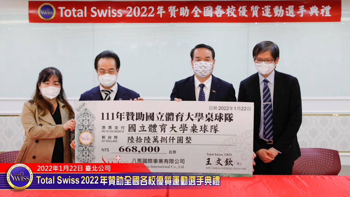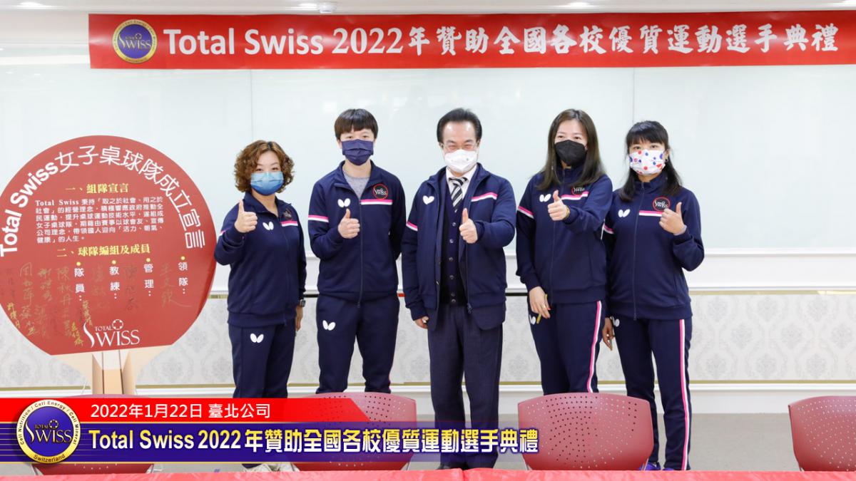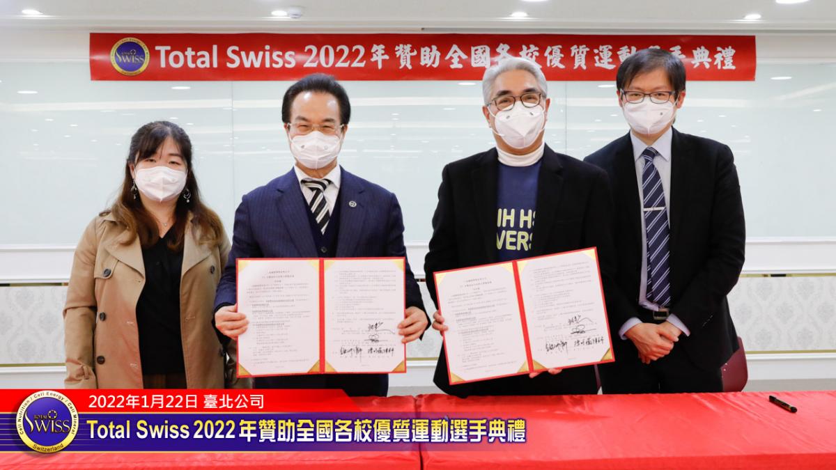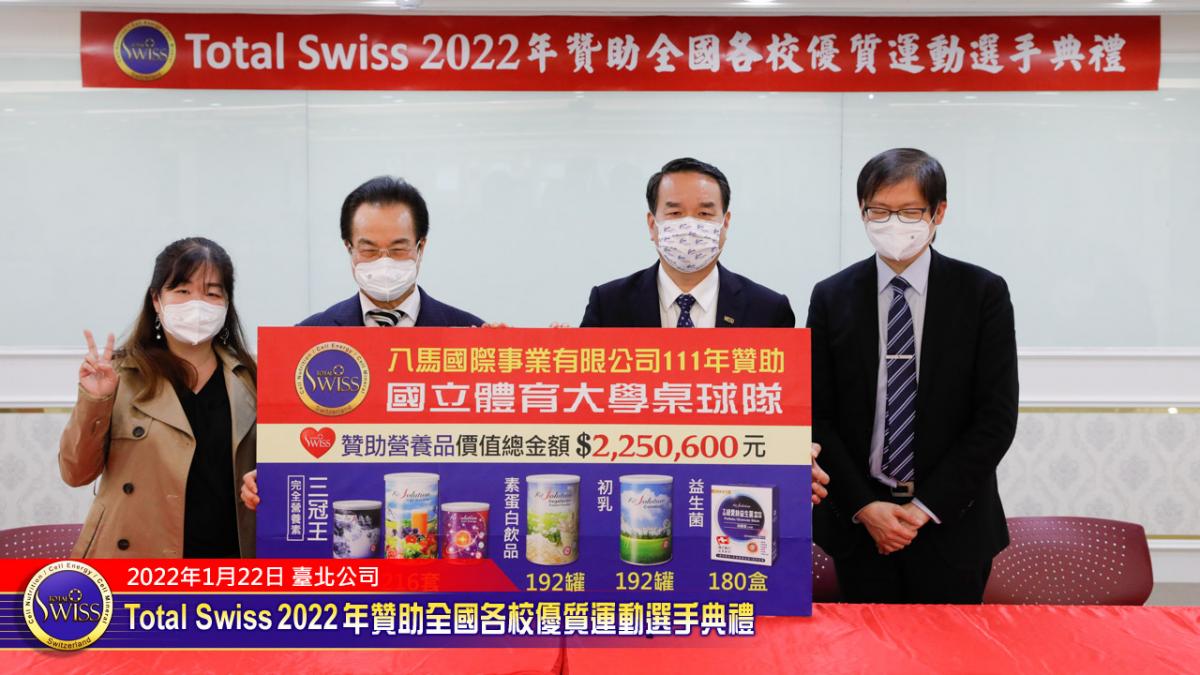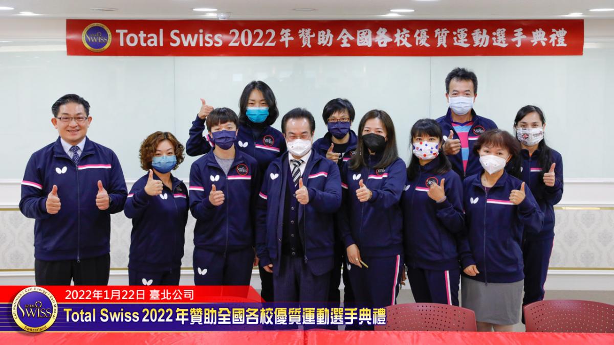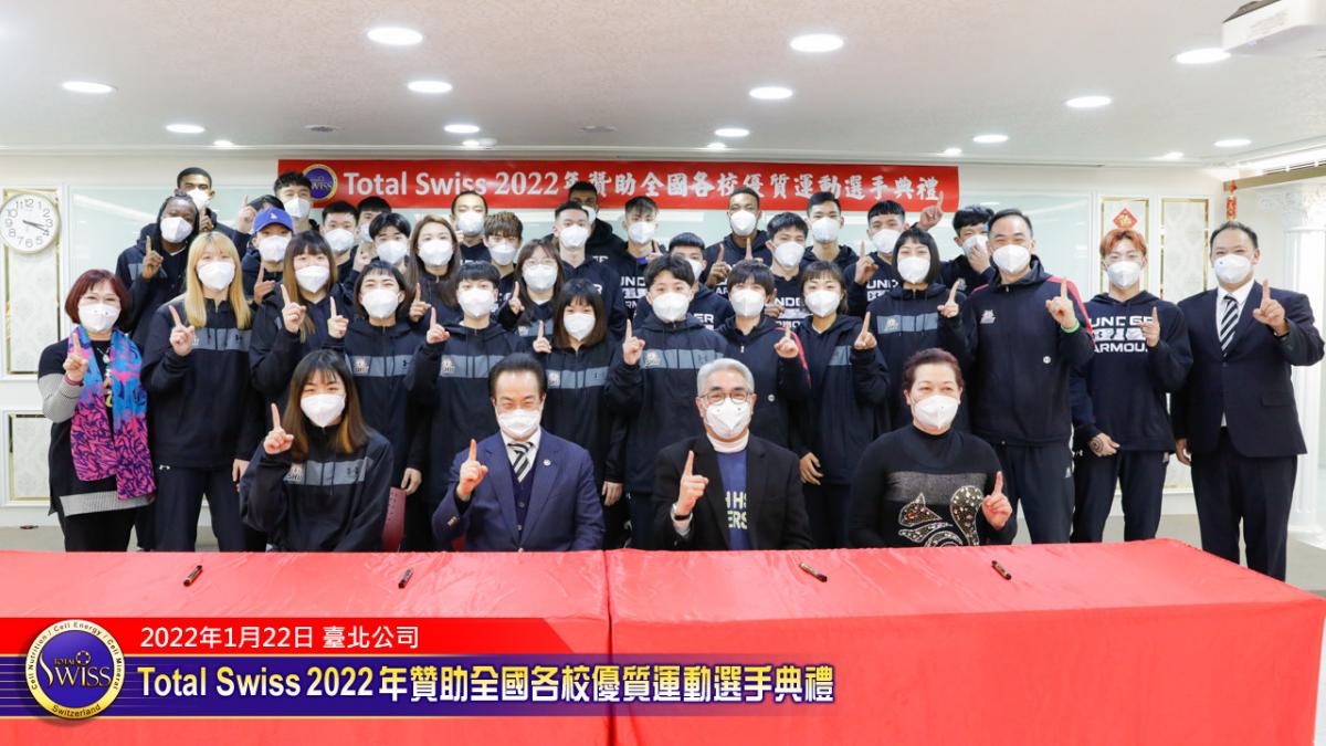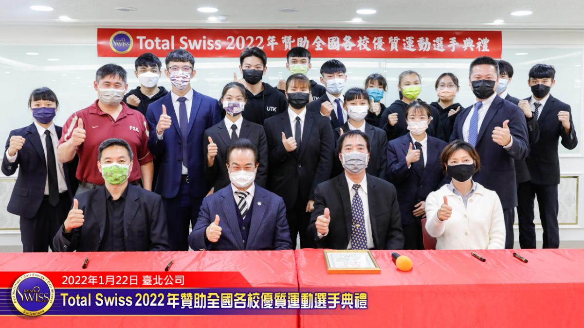 2022年1月22日下午,Total Swiss 2022年贊助全國各校優質選手典禮在Total Swiss在台北公司七樓舉行,包括國立體育大學、臺北市立大學、私立世新大學、台中富春國小、台南信義國小等受贈學校,莫不組成浩大的隊伍到場參加並且展現出運動員特有的活力與朝氣,使得這一場原本極為簡單的贊助儀式有了生動活潑的氣氛,也讓人感受到活動背後的深遠意義。
