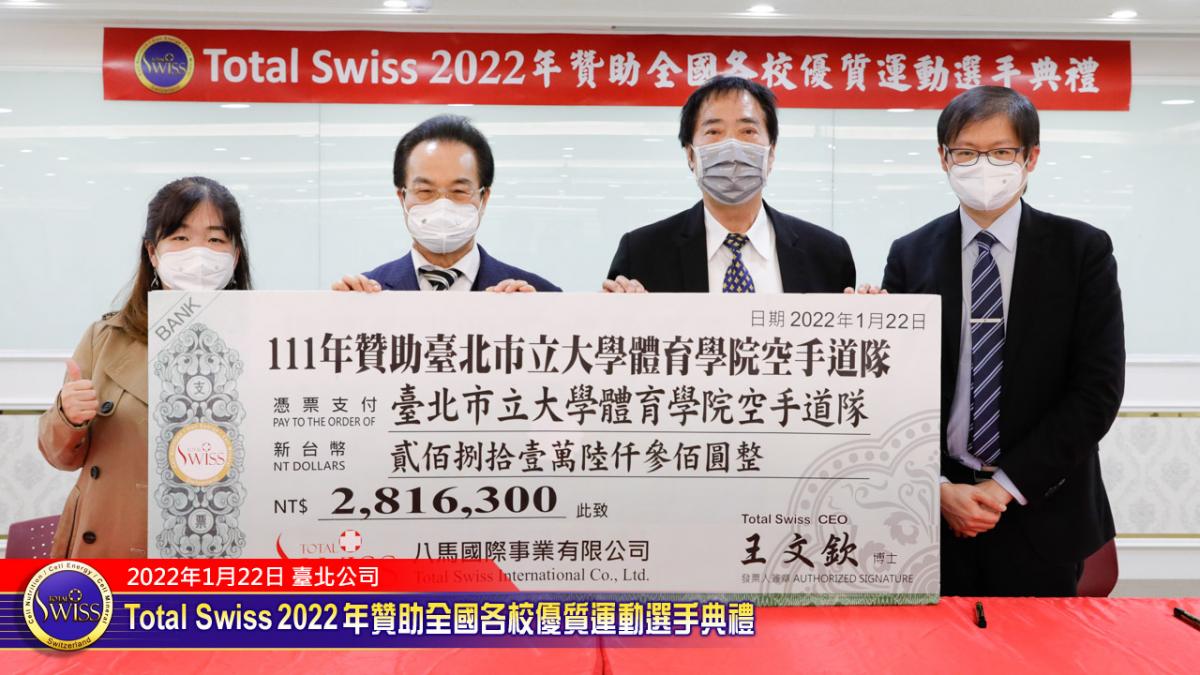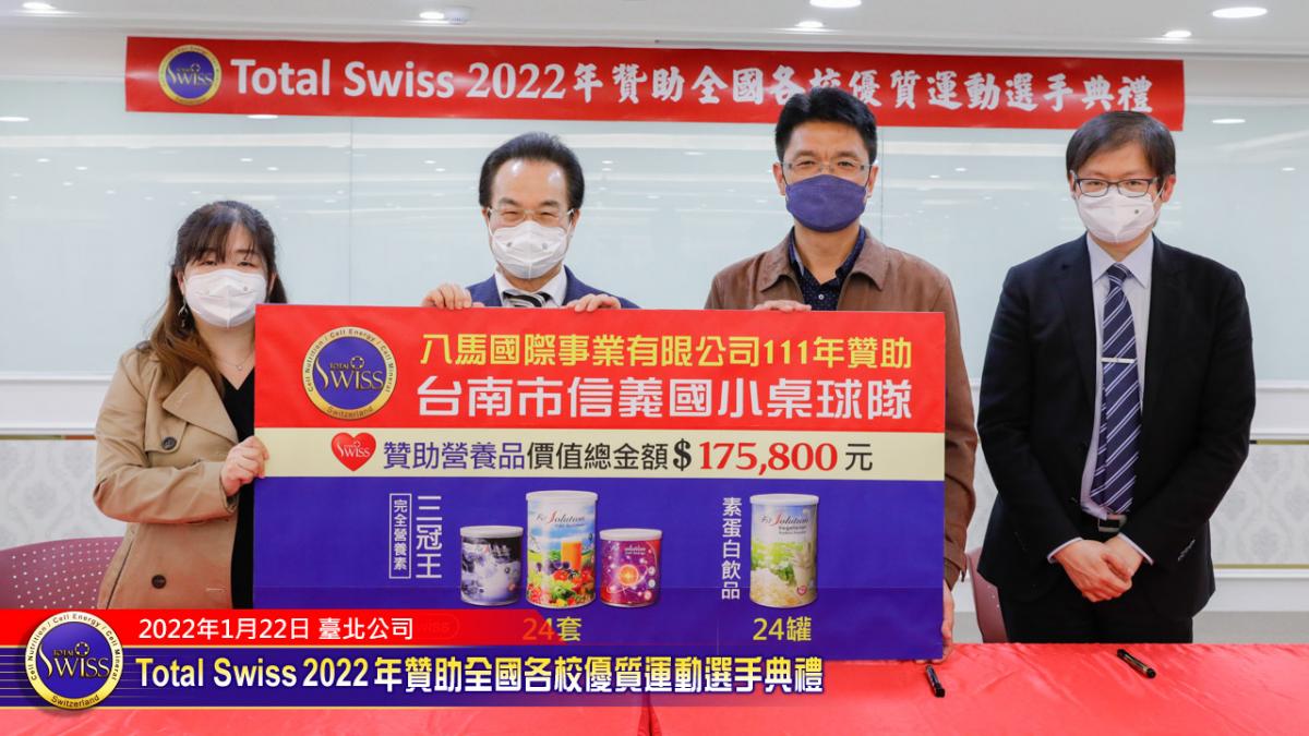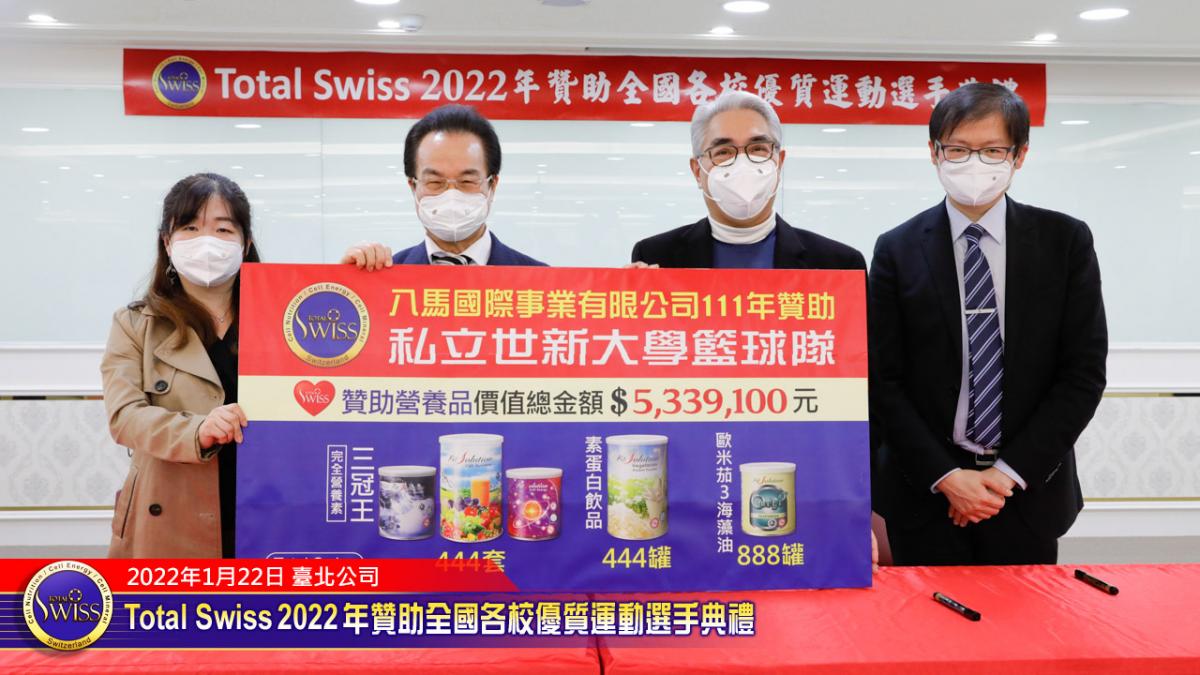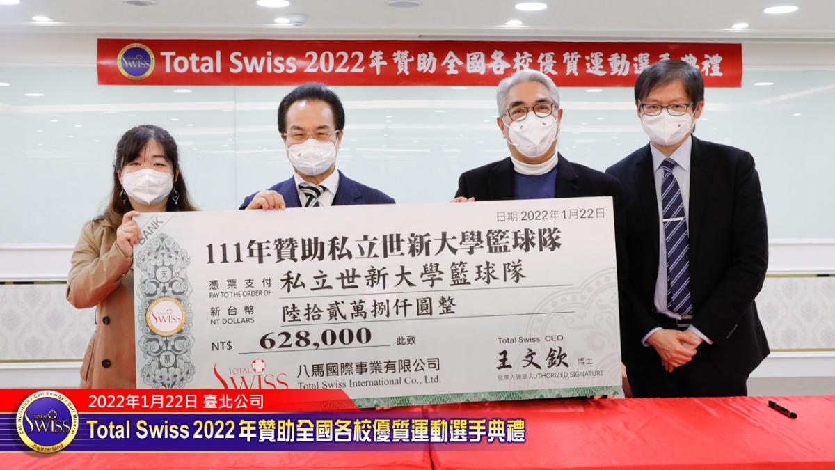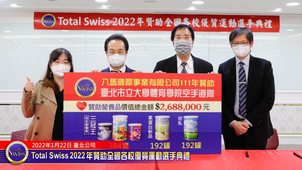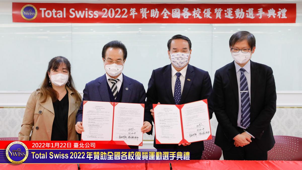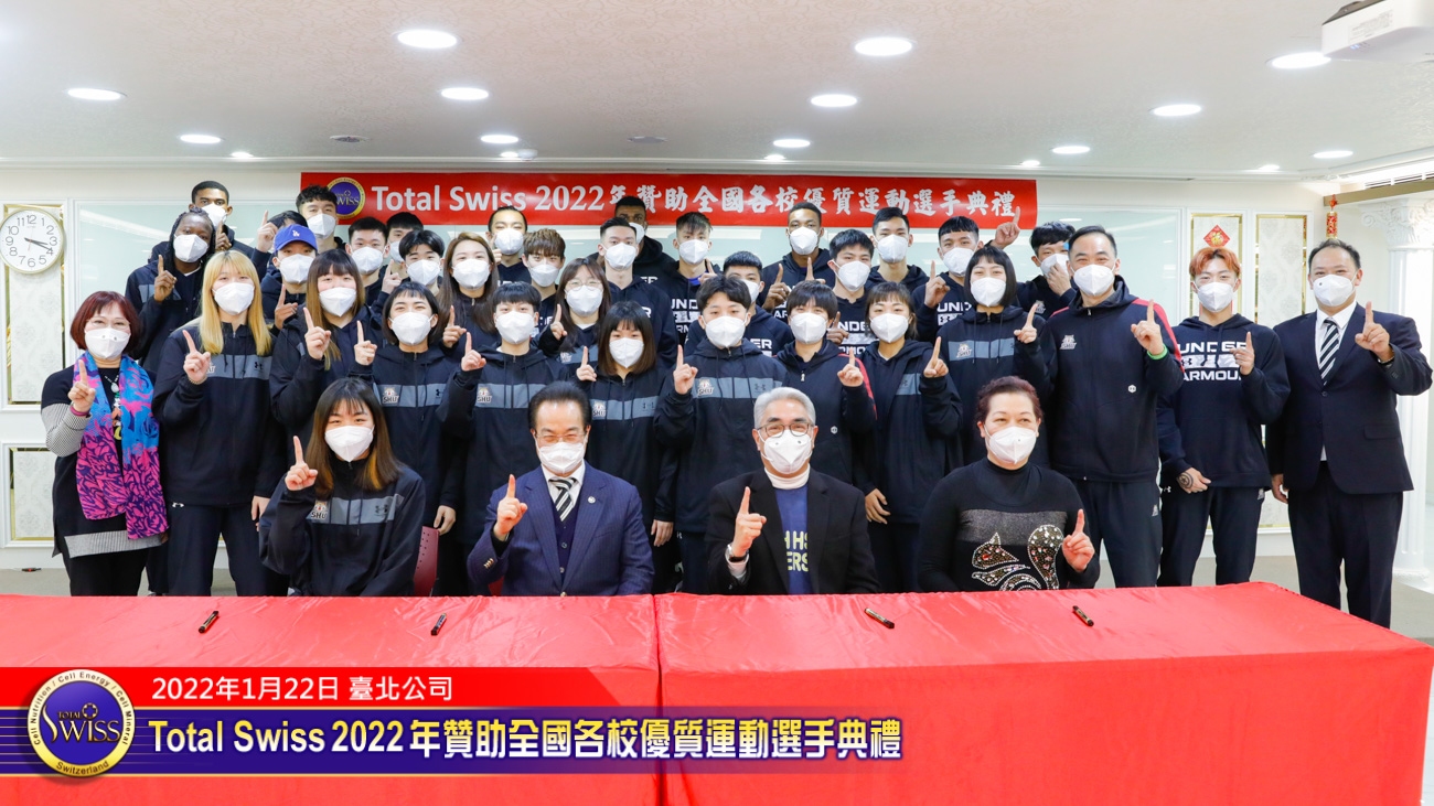 2022年1月22日下午,Total Swiss 2022年贊助全國各校優質選手典禮在Total Swiss在台北公司七樓舉行,包括國立體育大學、臺北市立大學、私立世新大學、台中富春國小、台南信義國小等受贈學校,莫不組成浩大的隊伍到場參加並且展現出運動員特有的活力與朝氣,使得這一場原本極為簡單的贊助儀式有了生動活潑的氣氛,也讓人感受到活動背後的深遠意義。