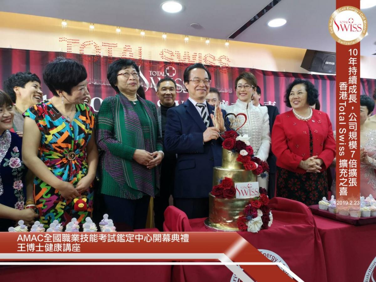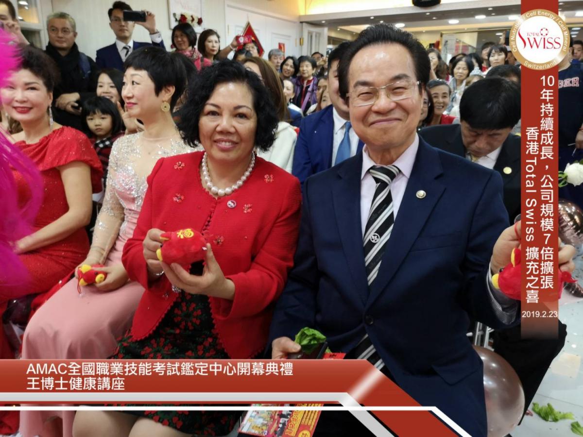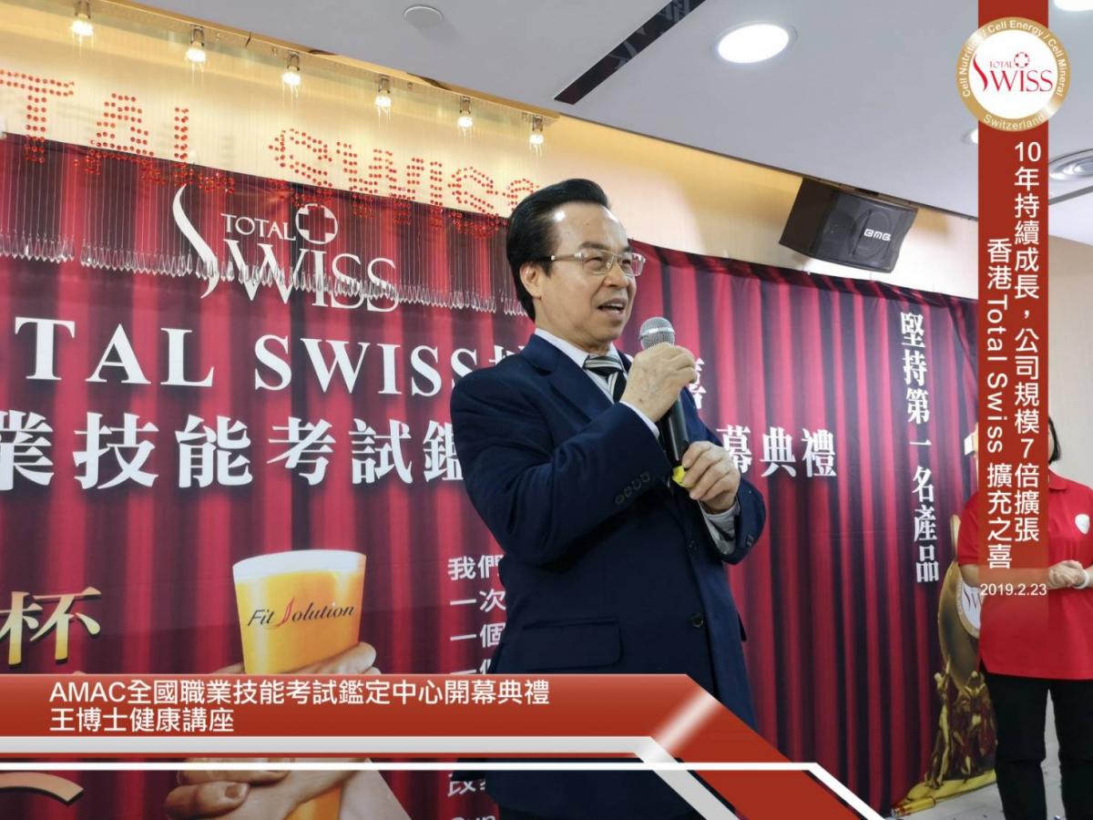 2019年2月23日,王博士飛往香港,主持Total Swiss香港公司擴大營業暨AMAC全國技能考試鑑定中心開幕典禮,並在典禮後舉辦2019年第11場健康講座。