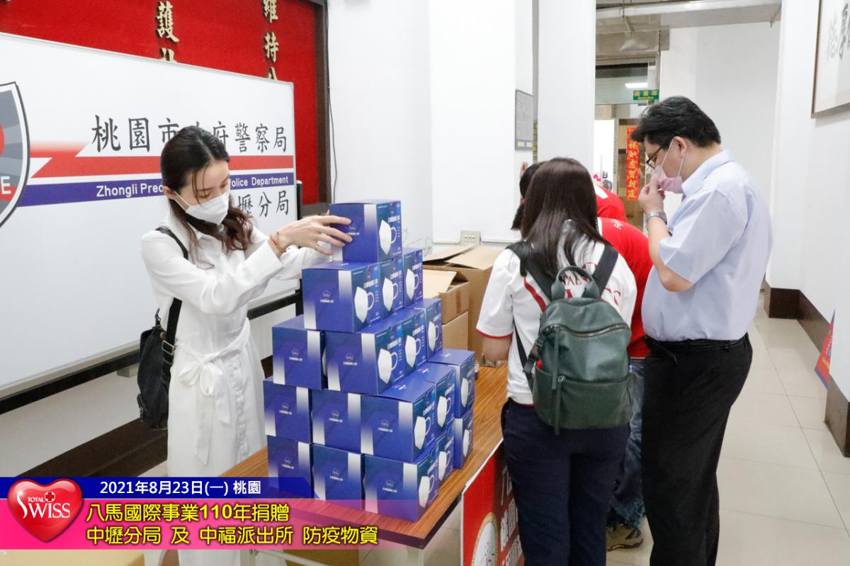 在王博士與中壢分局詹副分局長交流的時候,工作同仁已先行前往準備;王博士到達現場時,副所長沈國強也已經將Total Swiss防疫套組戴上,以回應Total Swiss帶頭關心基層員警的行動。