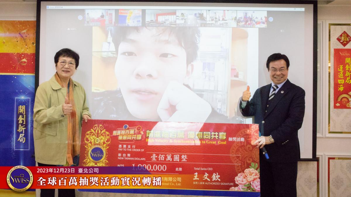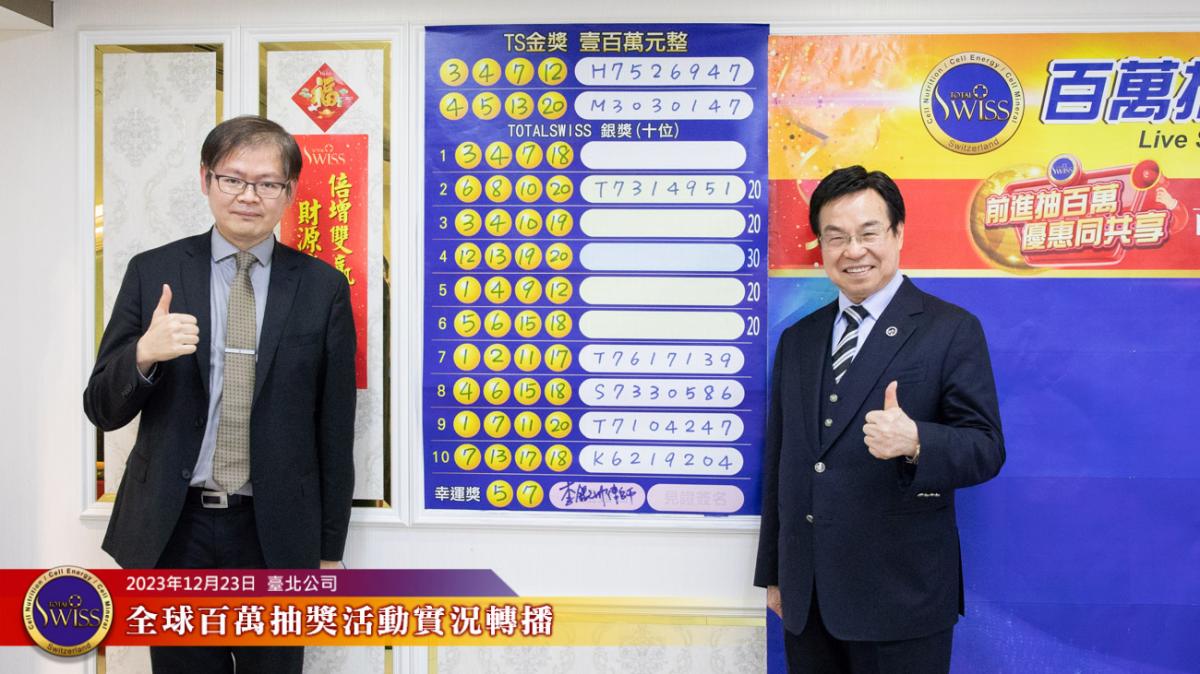 2023年12月23日中午12點半,Total Swiss第24回百萬抽獎全球實況活動在台北公司七樓舉行。