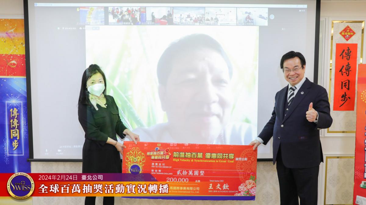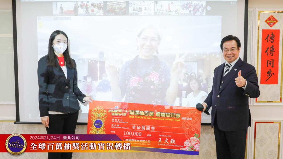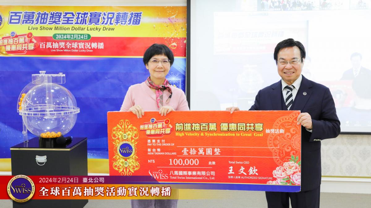 2024年2月24日下午,第26回Total Swiss全球百萬抽獎在台北公司七樓舉行,抽獎實況並透過視訊與全球各公司據點同步進行。
