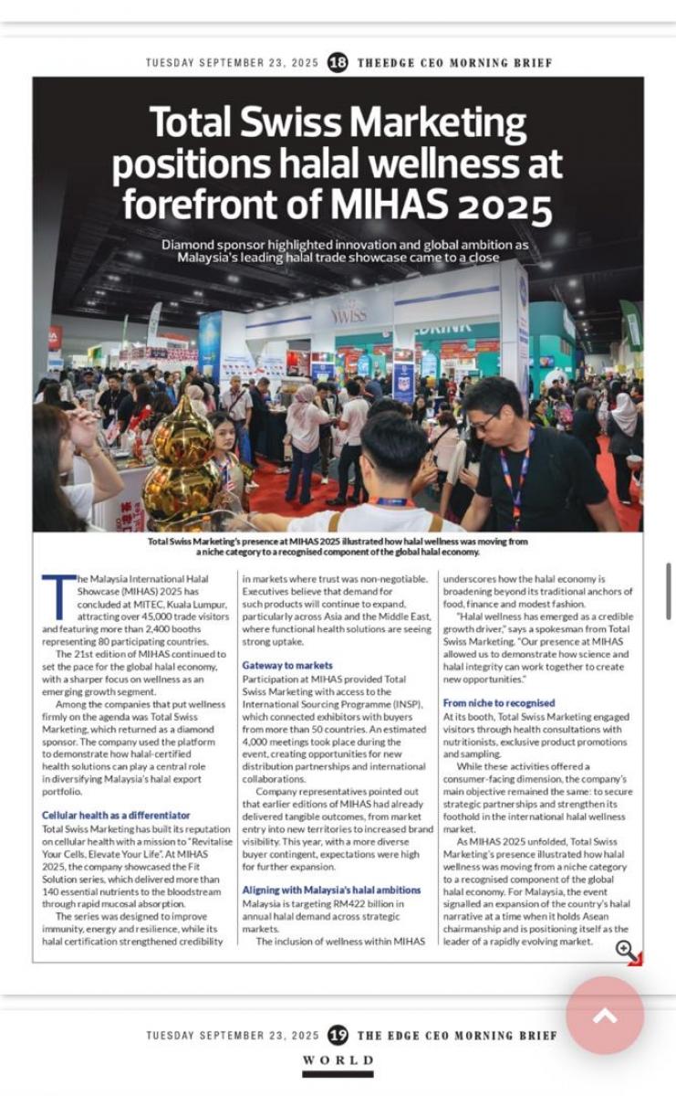 Total Swiss參加2025馬來西亞清真展,不只收穫滿滿,引進了來自不同國度的清真種子會員之外,Total Swiss在展場的亮眼表現,也得到了MIHAS主辦方的高度肯定,並以《Total Swiss 震撼2025年馬來西亞國際清真展(MIHAS)引領清真保健新趨勢》醒目標題為Total Swiss發表了一篇專題報導。