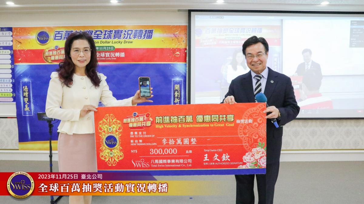 11月25日,第23回Total Swiss百萬抽獎活動在台北公司七樓舉行,可能是因為有3個一百萬元大獎的魅力,也可能是連續幾場培訓活動持續發酵,這一次抽獎活動來到台北現場的夥伴像鮭魚洄游一樣,把現場的座位都擠滿了。有一些姍姍來遲的夥伴,在現場繞了兩三圈,還是找不到可以坐下來的位置。