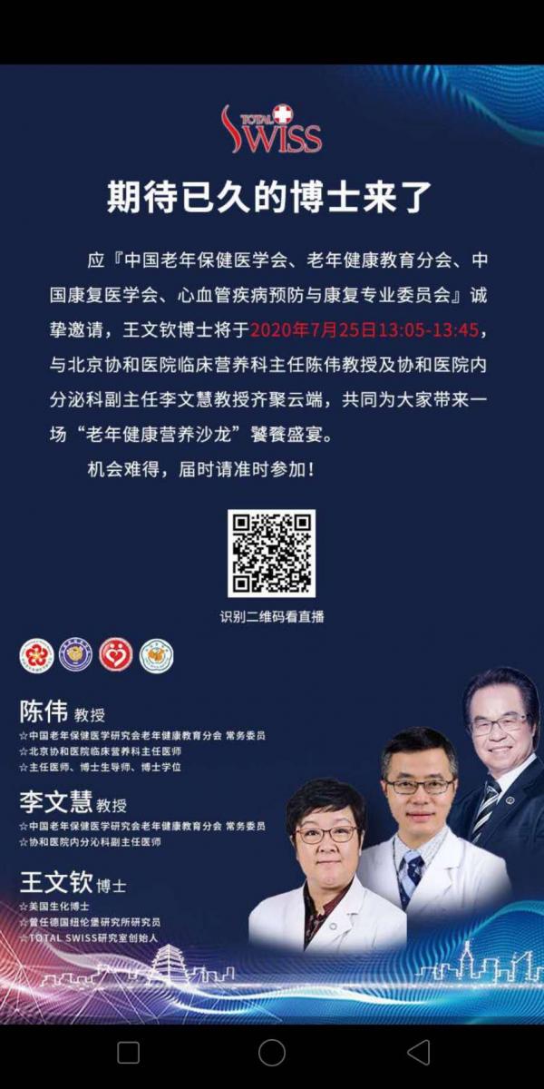 主張營養是金、藥物是銅的北京協和醫院内分泌權威醫生李文慧,以及主張老年人要透過營養吃得適度、吃得健康、吃得長壽的北京協和醫院臨床營養科名醫陳偉,都高度認同Total Swiss,認為王博士所梳理構建的健康五大論述細胞決定論、血液循環決定論、細胞代謝決定論、健康密碼365以及驗血報告,是全中國數以億計的老人們健康長壽的健康之道。