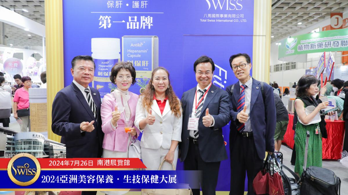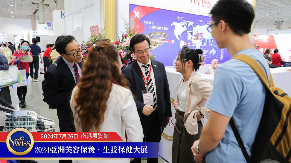 由於Total Swiss的展位吸睛、場面熱鬧,本次生技美容大展主辦單位展昭公司負責人林茂廷理事長也特別來到Total Swiss展位,親自向王博士致意。在交流中,林理事長向王博士豎起大拇指高度肯定Total Swiss紅不讓的人氣。另外,他也透露,每年超過1200個展位的亞洲生技美容大展,不只在亞洲長期名列第一,也是全球三大生技展之一,近年來,在台北舉辦的亞洲生技展一直是僅次於美國、歐洲(瑞士)生技展之外全球第三大生技展覽。
