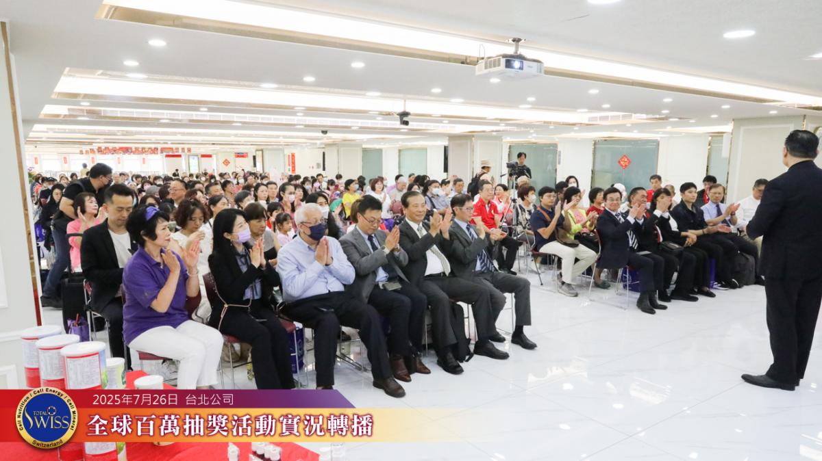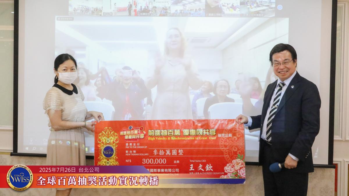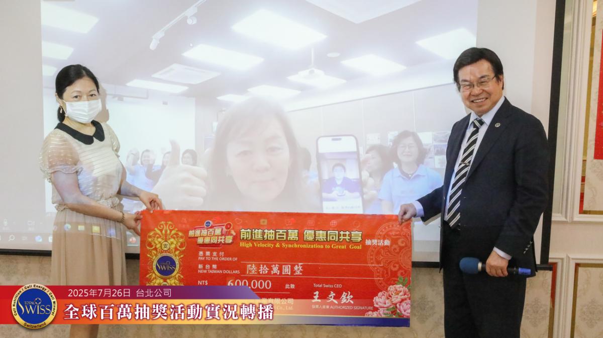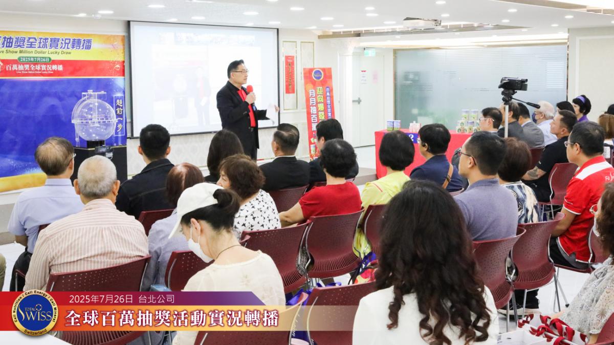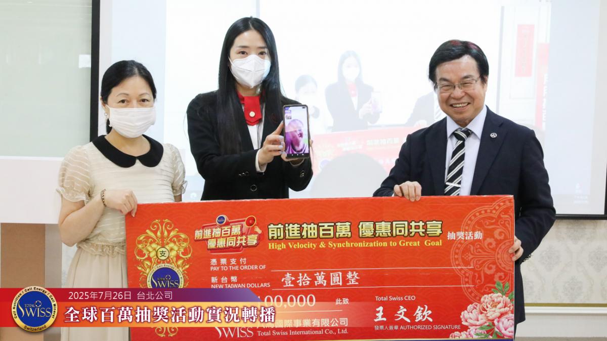 第43回Total Swiss百萬抽獎於2025年7月26日在台北總部7樓舉行,並透過連線向全球各據點同步放送。
