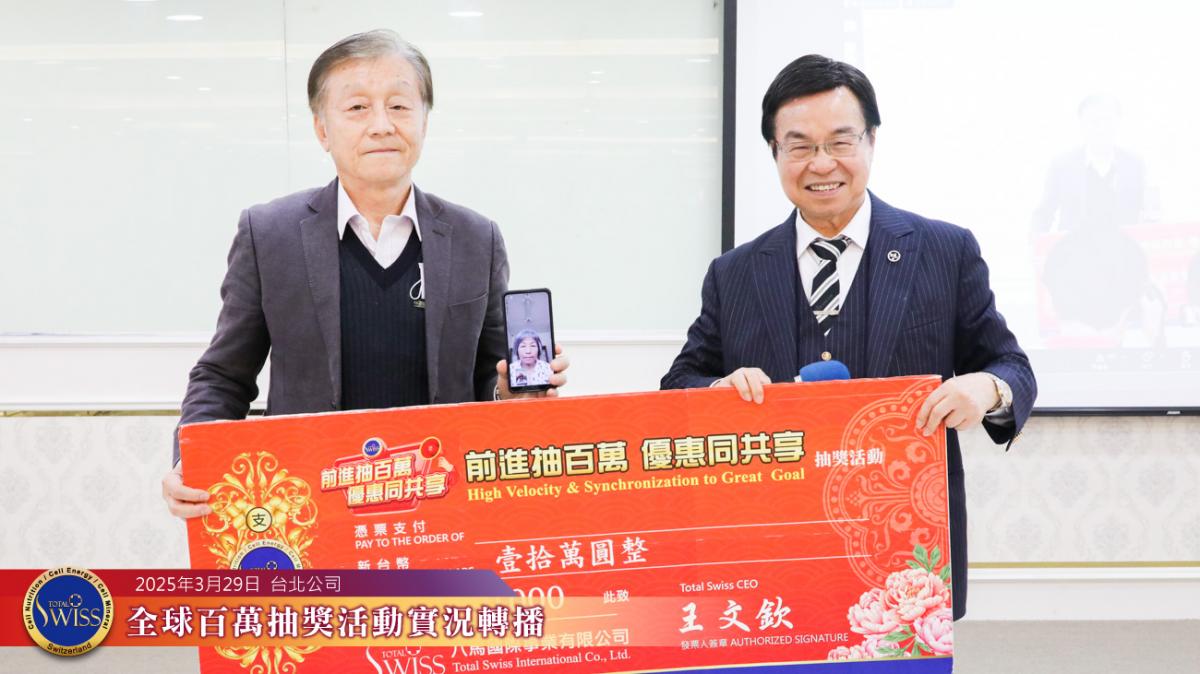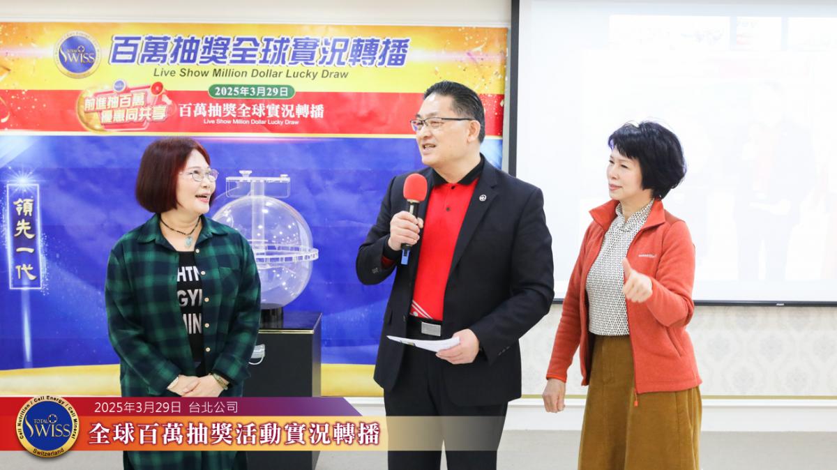 2025年3月29日下午,Total Swiss第39回百萬抽獎在台北公司七樓舉行。全台分公司、藥妝藥局以及全球各據點也透過線上轉播讓全球夥伴可以同步參與。