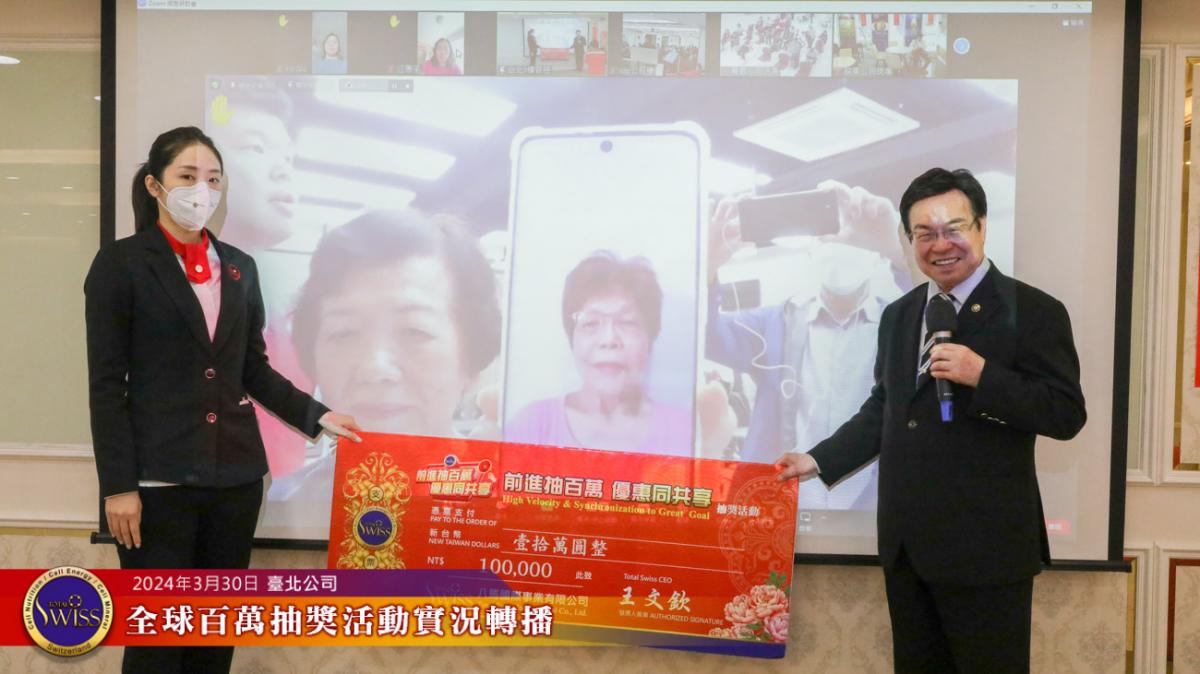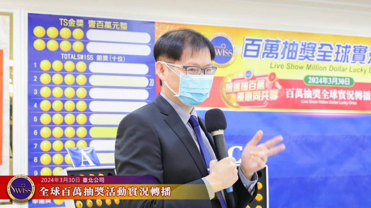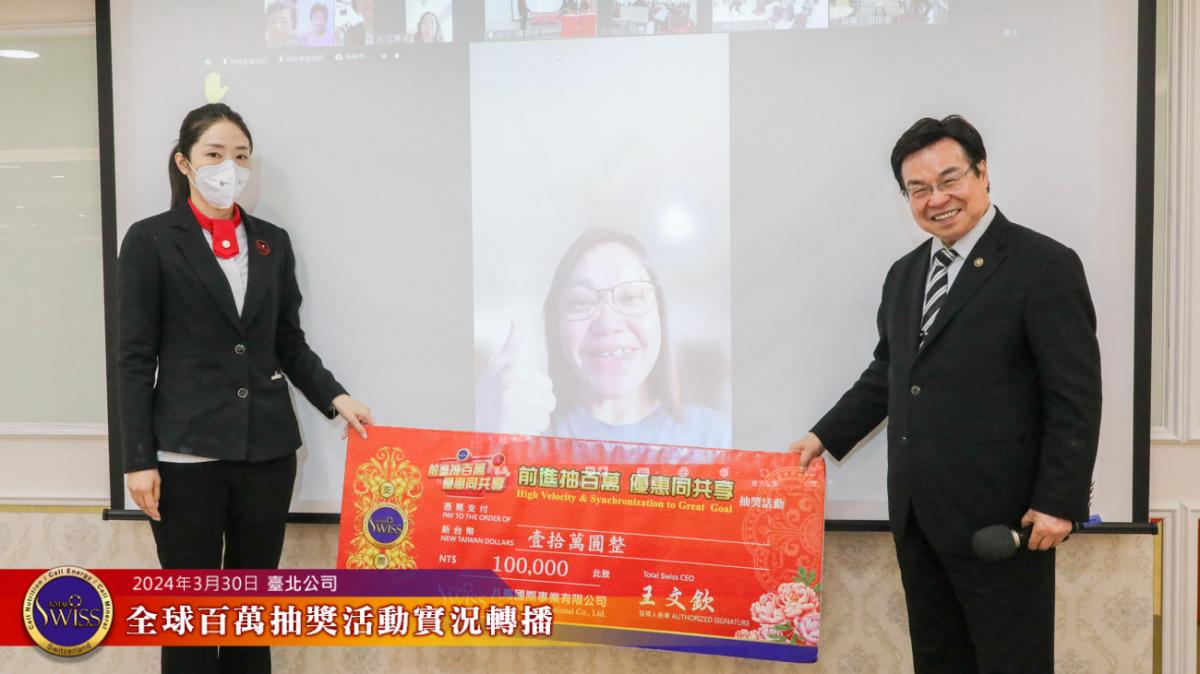 Total Swiss第27回全球百萬抽獎,於2024年3月30日下午一點鐘在台北公司七樓舉行,除台北現場外,活動全程也向台灣各區據點及全球16個市場進行實況轉播。
