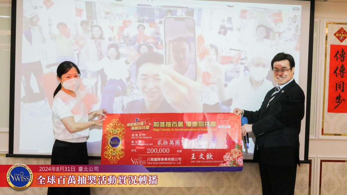 Total Swiss氣勢如虹,原本就異常忙碌的王博士也就更為忙碌了,整個八月,只要他在台北,每一天他都有見不完的客人與夥伴,在8月31日百萬抽獎展開之前,上午及中午時間,王博士又連續接待了多組賓客,包括瘋起雲湧龍舟隊、書法家中華書道學會理事長楊旭堂以及來自馬來西亞的鄭有文拿督夫婦等等。