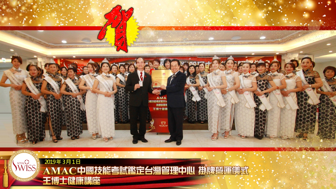 在王博士令人振奮的爭霸中國健康市場講話之後,AMAC中國技能考試鑑定台灣管理中心儀式由王博士與黃家銘總經理共同揭幕、正式掛牌營運。