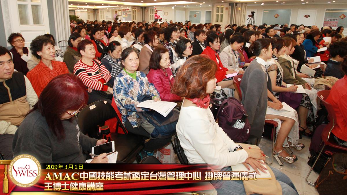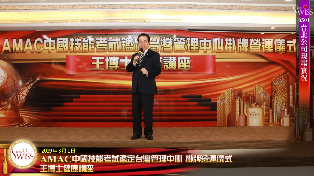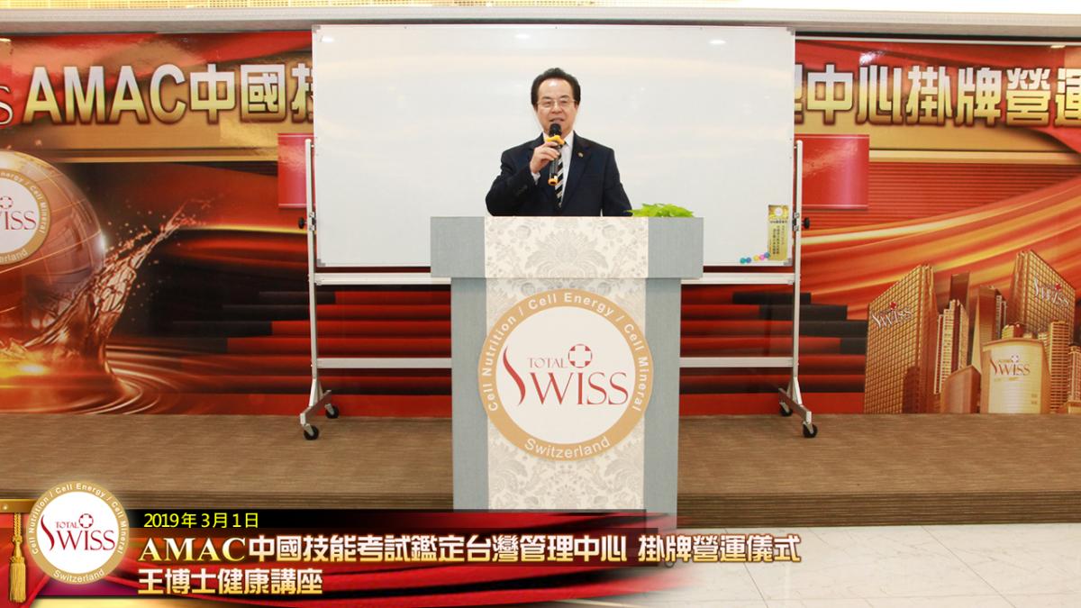 經過一個多月奔忙,Total Swiss全球創辦人王文欽博士在新加坡主持AMAC掛牌揭幕儀式及第12場健康講座之後,2019年3月1日,王博士回到台灣,於台北公司舉行AMAC掛牌揭幕及健康講座。