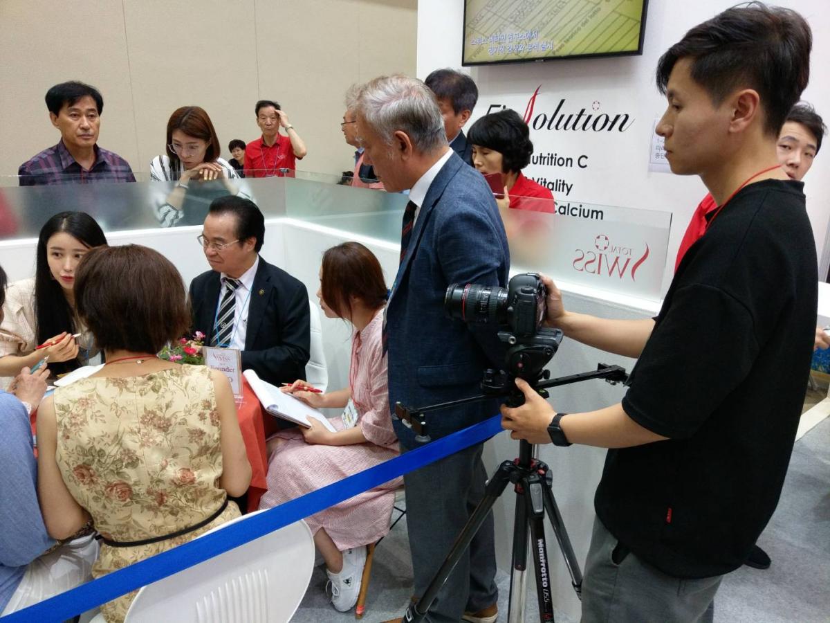 午前,COEX人潮越來越多,Total Swiss的展位已經水洩不通。王博士上午在韓國首爾公司錄製韓國公司的廣告影片,下午來到韓國COEX展覽會場,Total Swiss的展位不斷滿溢出來。