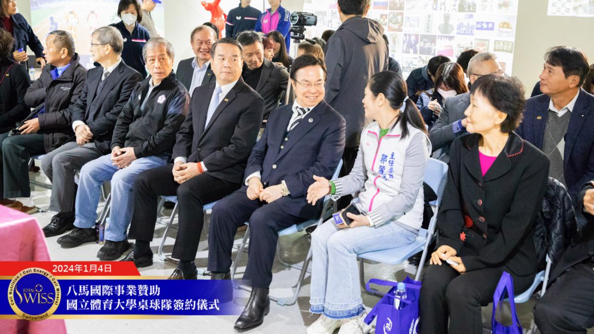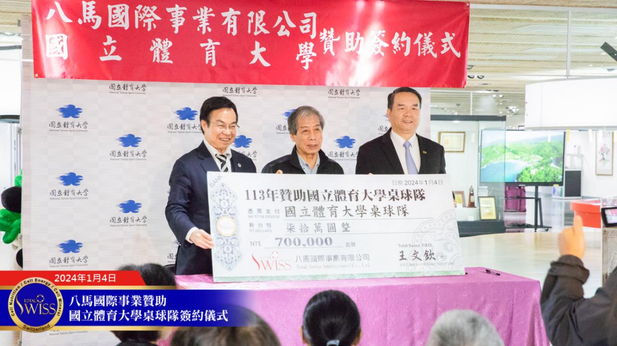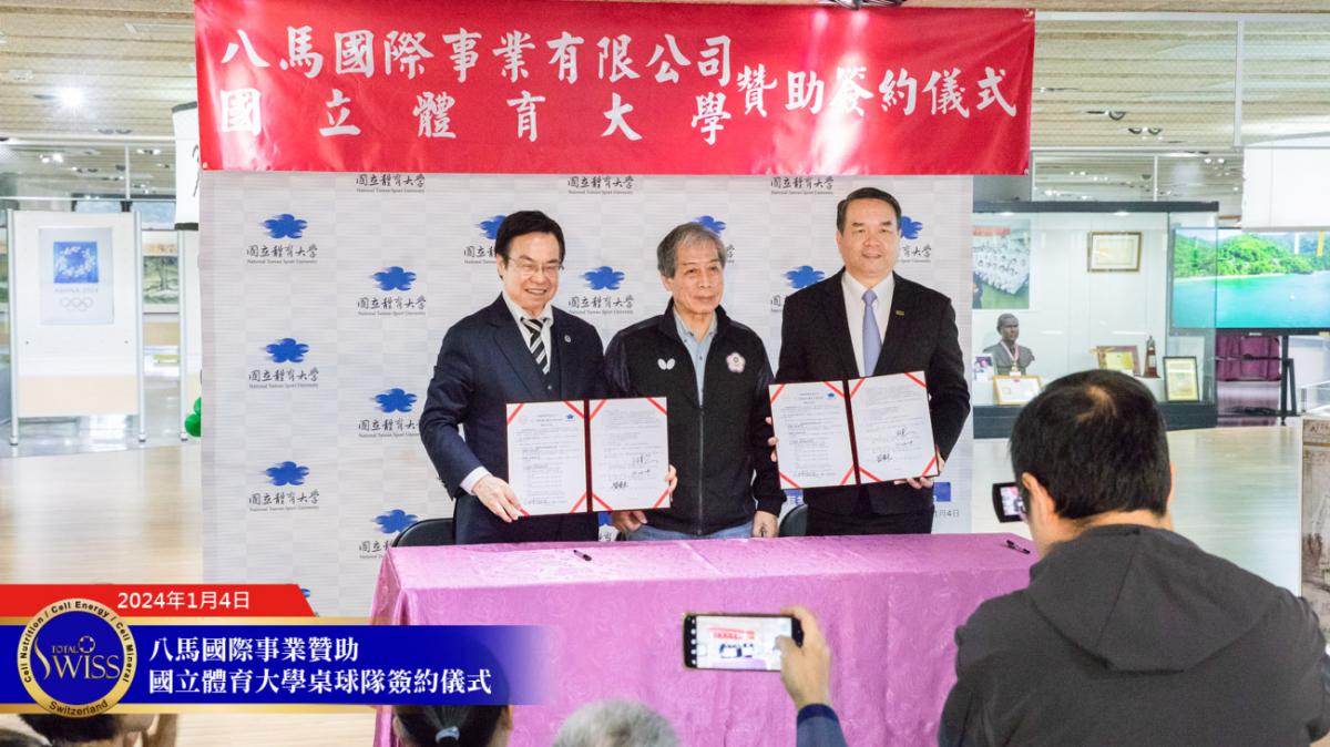 2024年1月4日上午10點,Total Swiss八馬國際事業贊助國立體育大學簽約儀式於國立體育大學體育與圖書博物館成果展區舉行。
