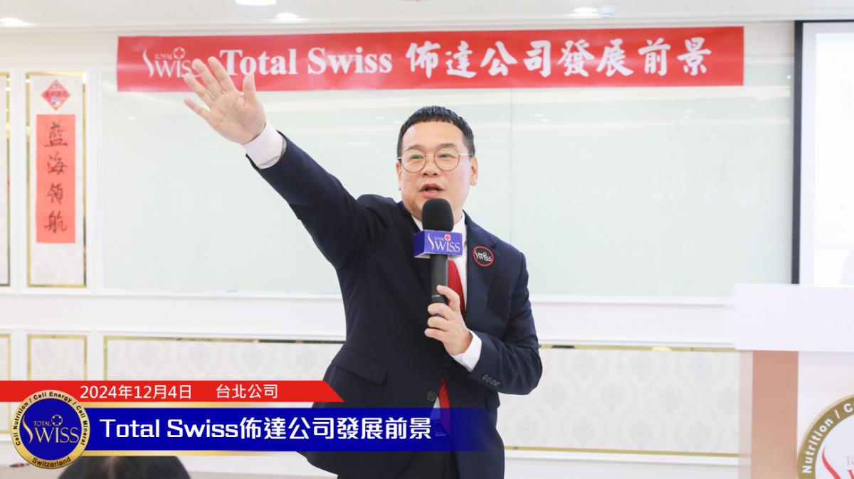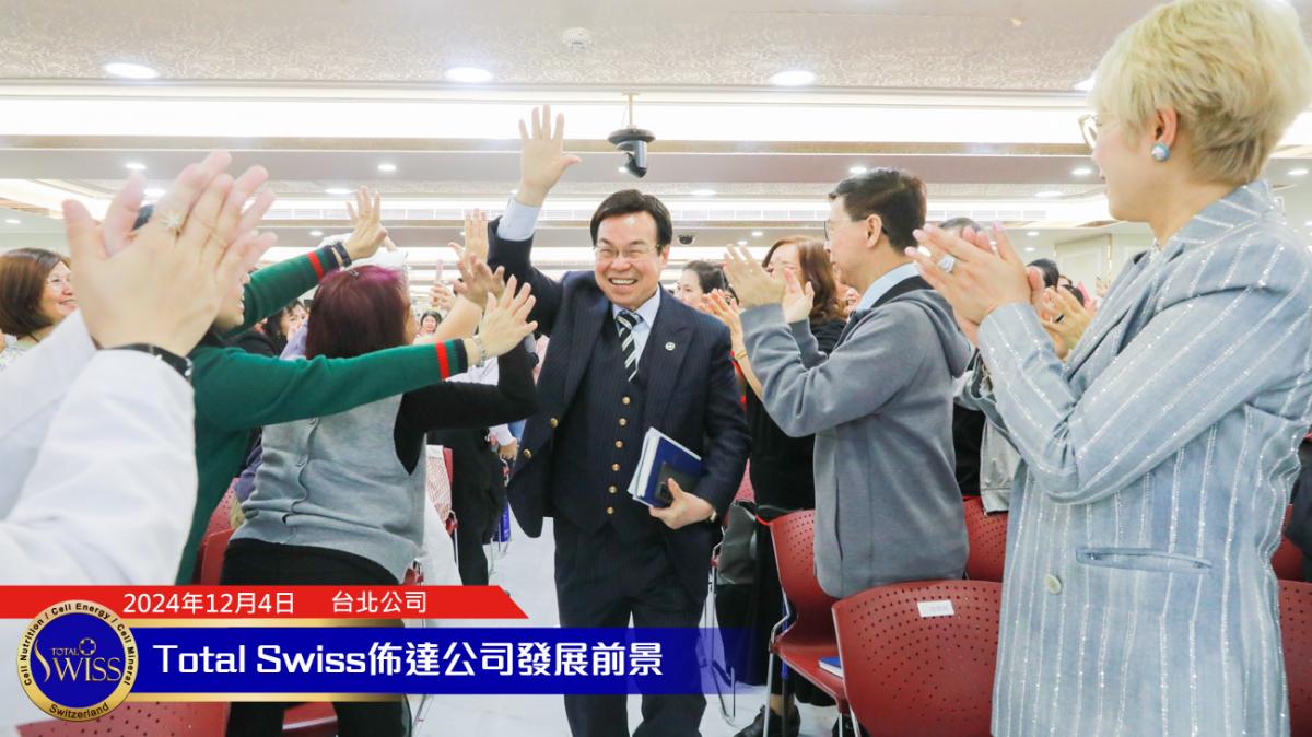 2024年Total Swiss全球頒聘大會於12月4日正式揭開序幕,下午1點30分,在張在心副總、孫守德總裁的引言之後,王博士向齊聚Total Swiss台北公司七樓跟二樓,來自全球16個市場的一千多位領導人,詳細闡述了別人想學也學不來,想追也追不上的未來五年六大願景。