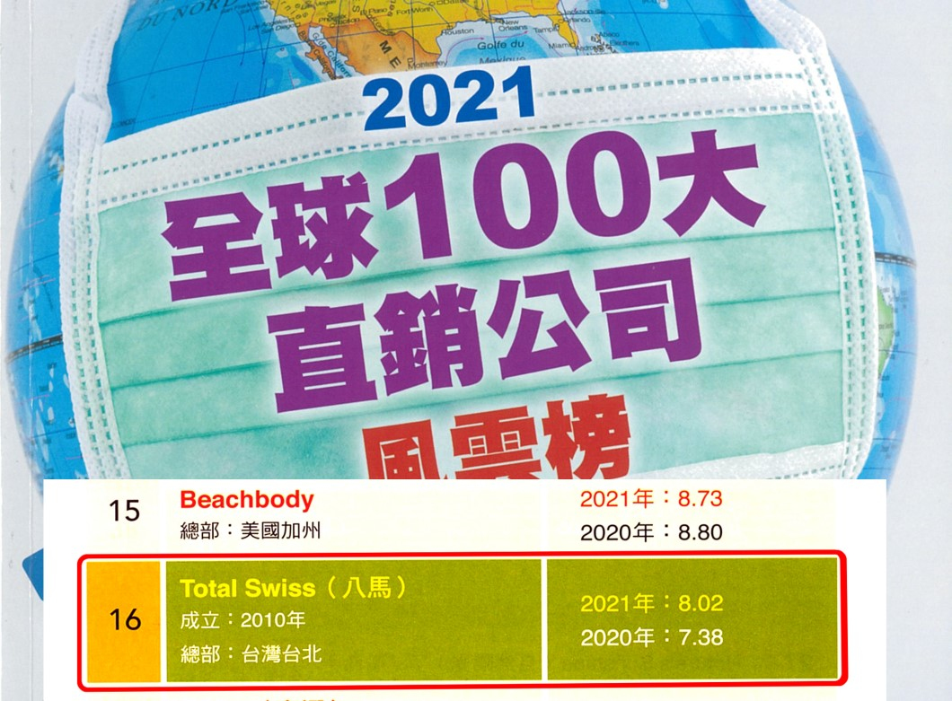 現在,2022年6月號直銷世紀的《2021年全球一百大直銷公司風雲榜》已經正式出爐,Total Swiss全球16個市場的2021年營業總額為8.02億美元,榮登全球百大第十六名,較2019年的第19名再度向前挺進三名。