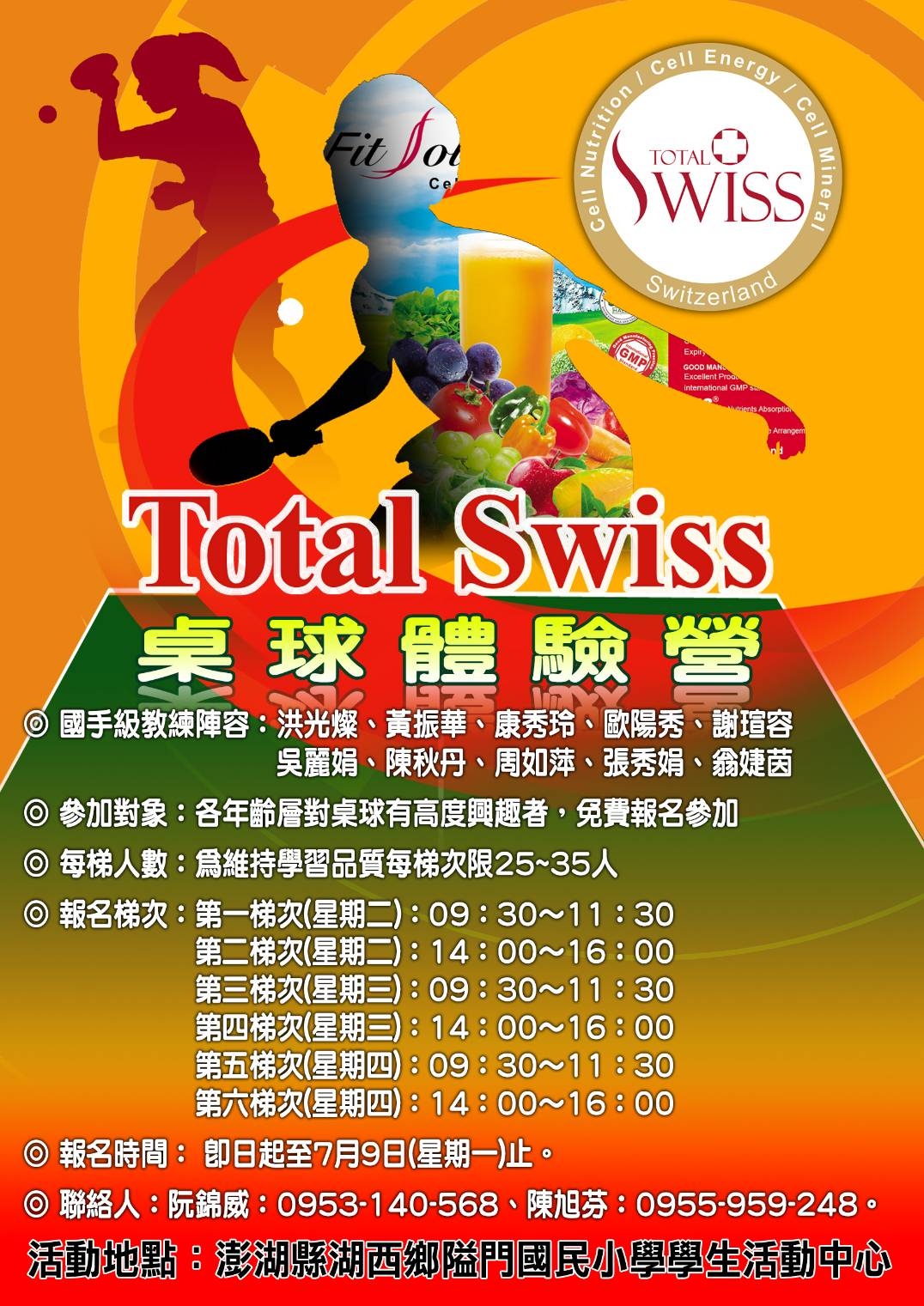 由十位國手及一位奧運選手組成的Total Swiss桌球體驗營,下鄉澎湖, 於7月10日起至12日假隘門國小舉辦三天。
