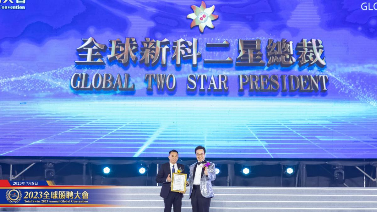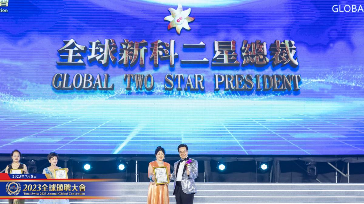 第二位發言的二星總裁是來自韓國的郭玔。在郭玔發言之前,王博士特別介紹,他們一家四個總裁,爸爸、媽媽和一對雙胞胎女兒都是Total Swiss韓國的總裁,女兒也創下Total Swiss韓國最年輕成為總裁的紀錄。