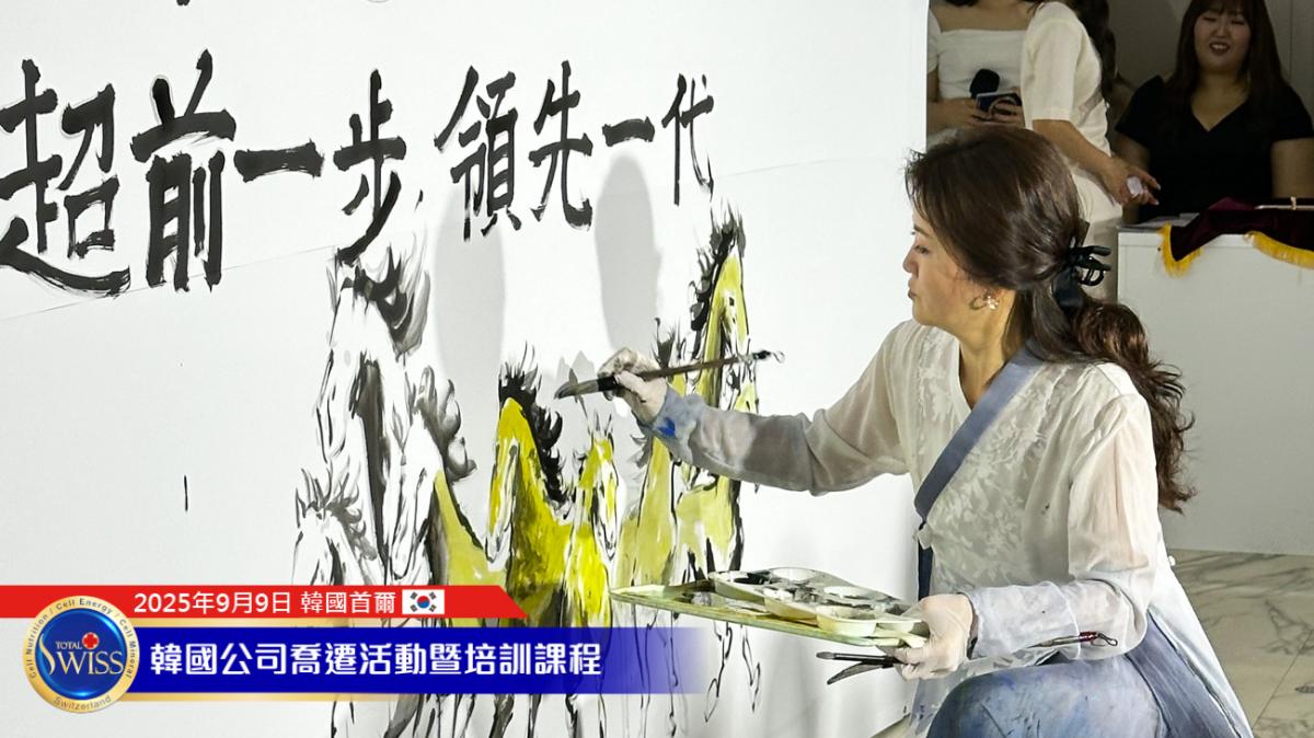 然後,林多仁邀請韓國書法藝術 Mentoring 協會會長李花善登台進行現場揮毫,他用韓文書法寫出大大的Total Swiss,用中文寫出超前一步、領先一代,再畫出八匹奔騰的駿馬,象徵八馬國際馳騁全球。